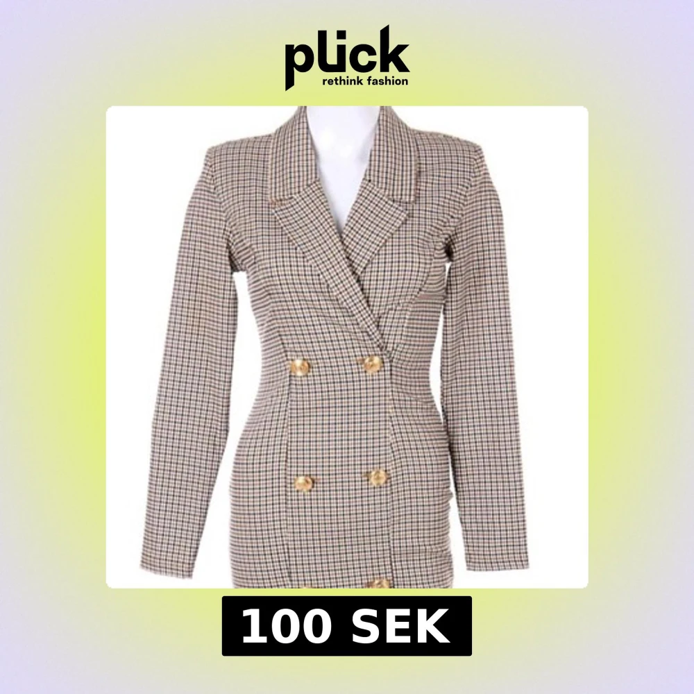 Snygg blazerklänning från Amisu i storlek 36 med rutigt mönster i beige, svart och brunt. Klänningen har dubbelknäppning med guldiga knappar, markerad midja och långa ärmar. Perfekt för dig som gillar en chic och trendig look.
