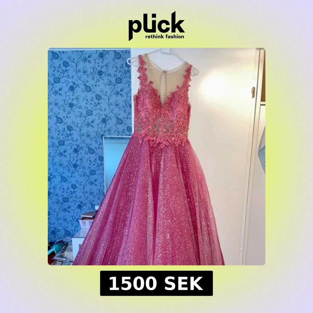 Magisk rosa långklänning med glittrande tyg och vacker spets upptill. Djup v-ringning och transparent mesh vid axlarna ger en elegant look. Perfekt för bal eller festliga tillfällen.