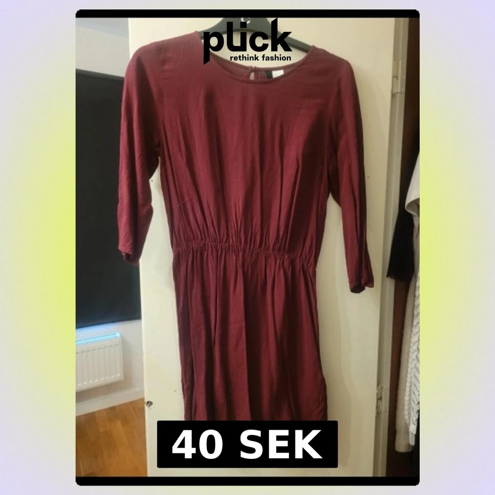Snygg vinröd klänning från HM i storlek 36. Modellen har rund hals, resår i midjan och trekvartsärm. Klänningen är kort och har en enkel, stilren design som är lätt att matcha. .