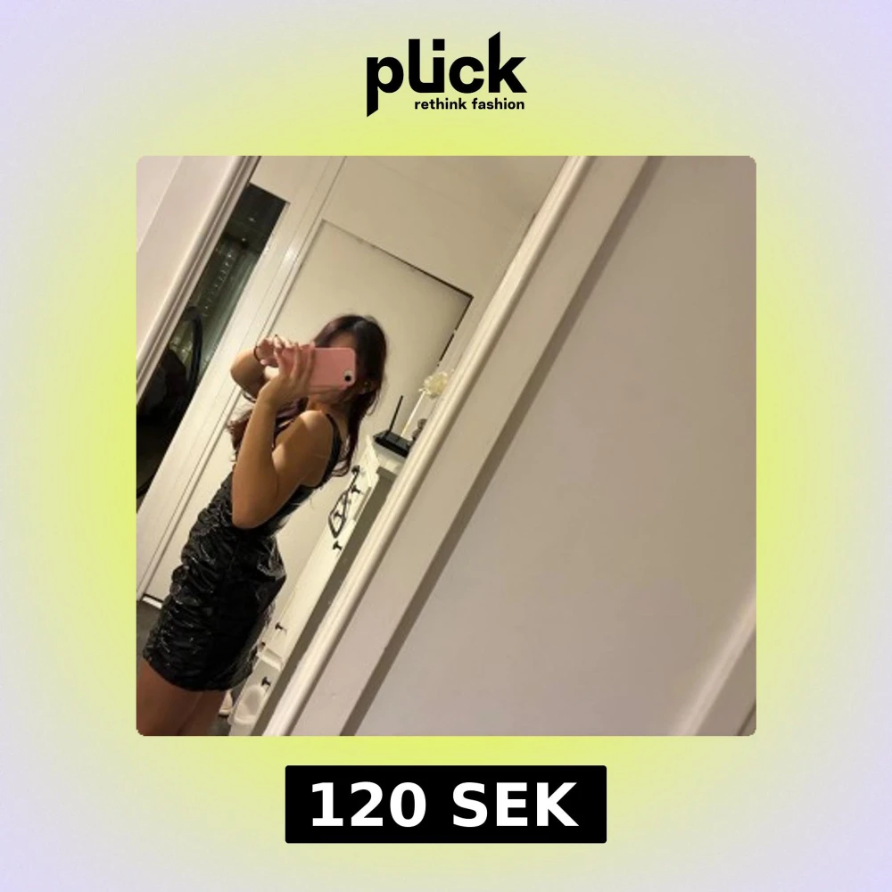 Säljer en svart glansig kort klänning med smala axelband och rynkade detaljer längs sidorna. Klänningen har en tight passform och är tillverkad i ett syntetmaterial som ger en cool, wet look-effekt. Perfekt för dig som vill sticka ut med en edgy stil.