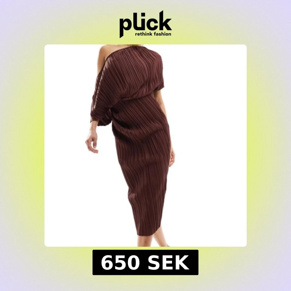 Snygg brun långklänning med plisserat tyg och offshoulder-design. Klänningen har en asymmetrisk överdel och smal passform som framhäver siluetten. Perfekt för dig som gillar unika detaljer och stilren look.