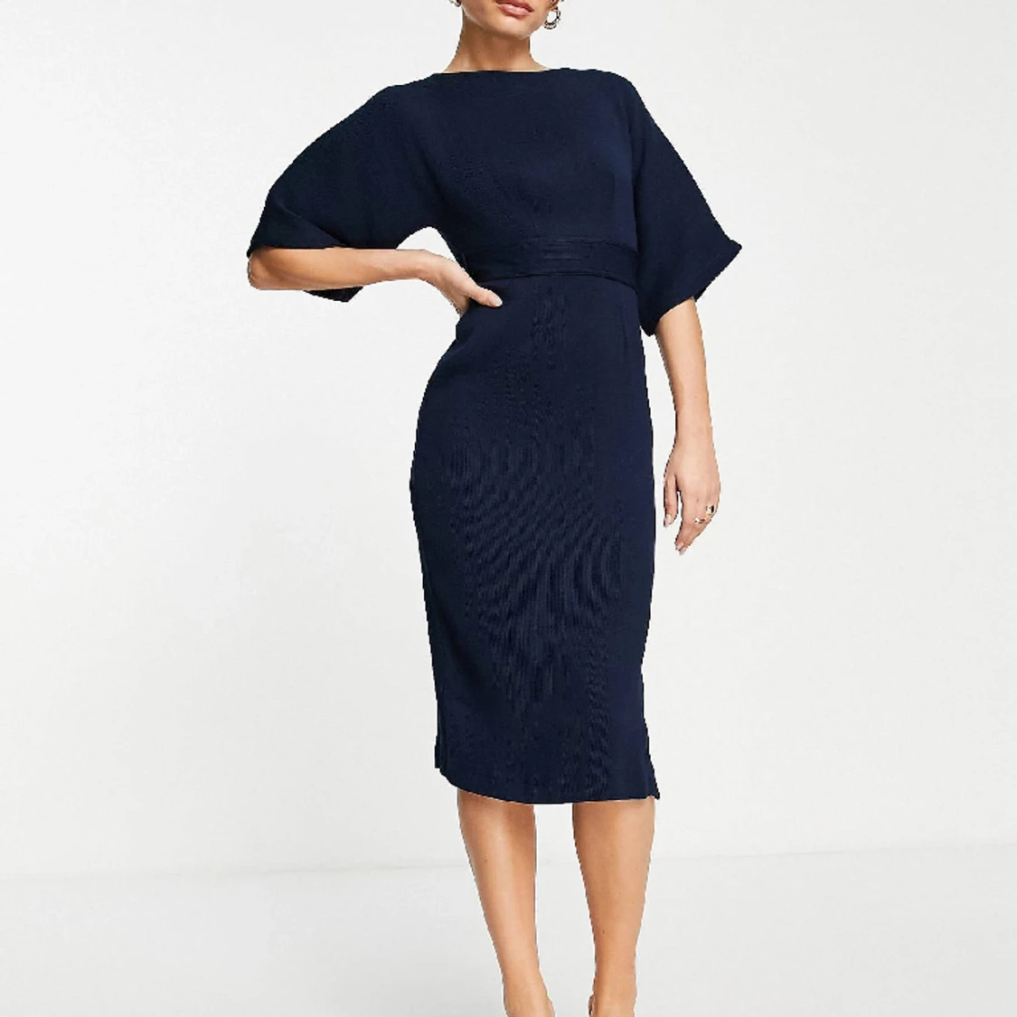 Aldrig använd, jag har bara testat den då jag inte hann göra en retur. Riktigt bra material. Marinblå ribbad fodralklänning med knytskärp. Köpt för 929kr