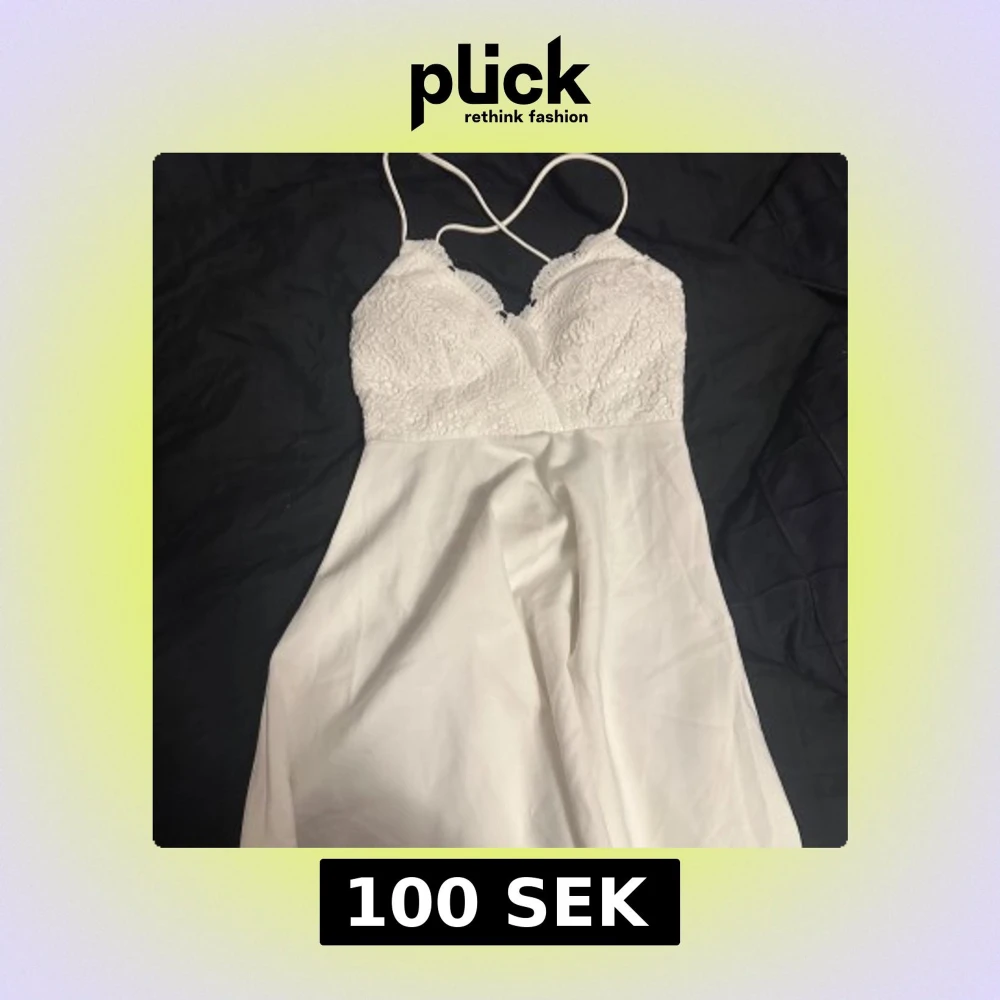 Säljer en elegant vit klänning med spetsdetaljer på överdelen och tunna axelband. Klänningen har en vacker v-ringning och är perfekt för sommarens festligheter. Den är tillverkad i ett lätt och bekvämt material som ger en fin passform.
