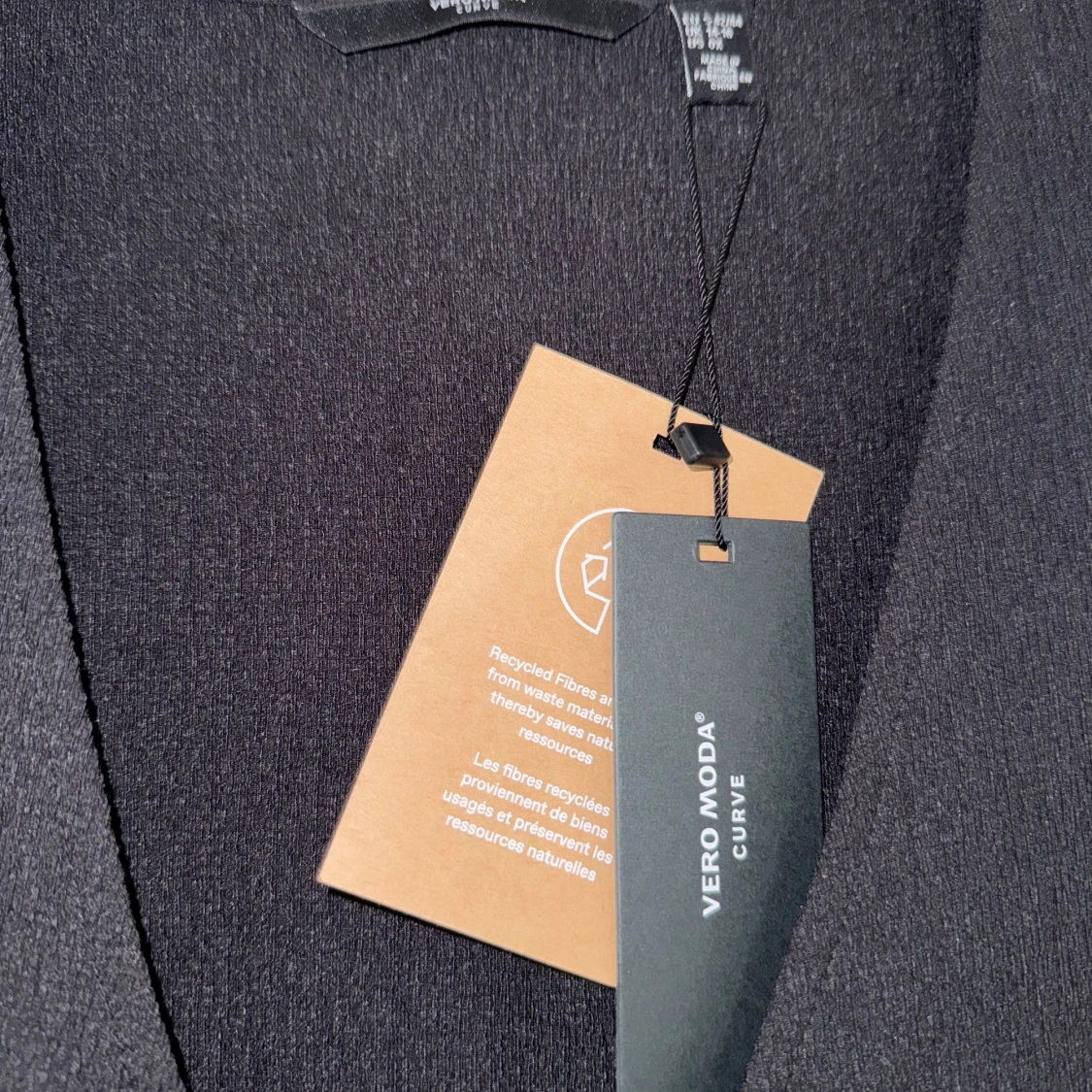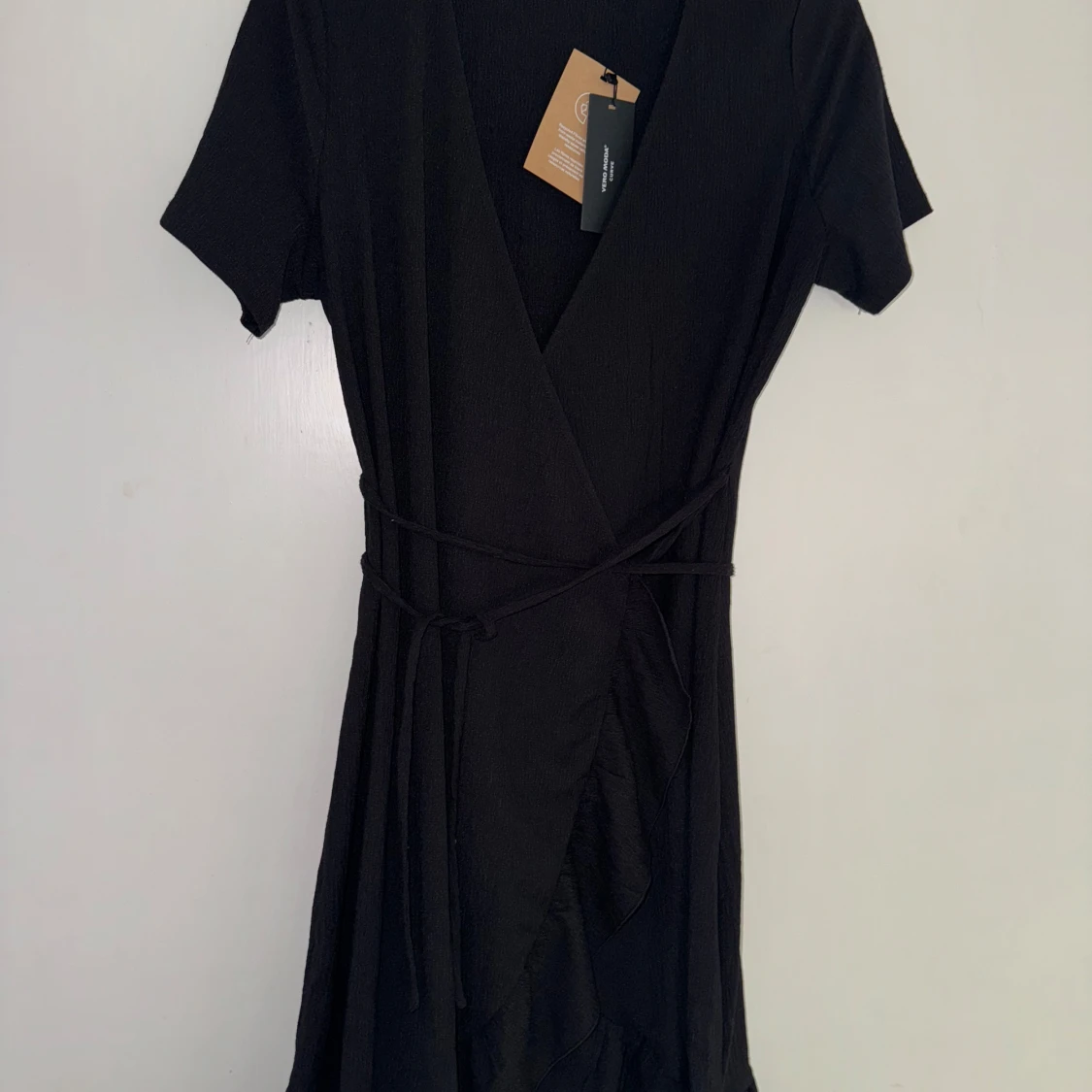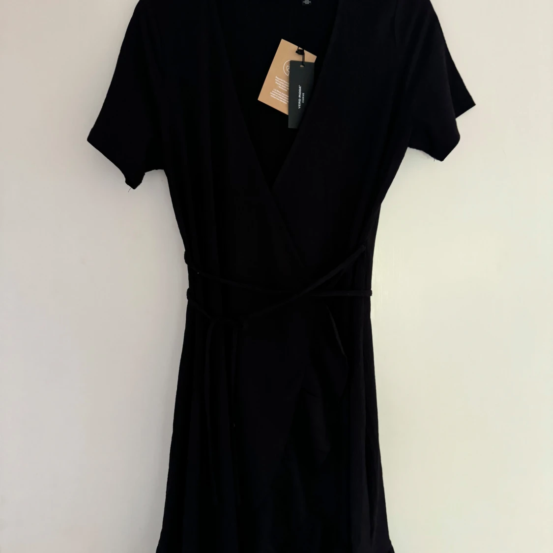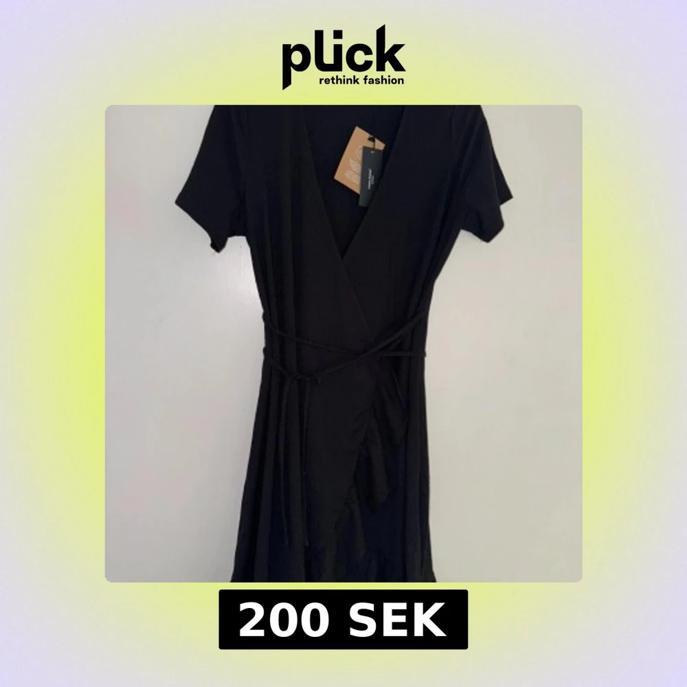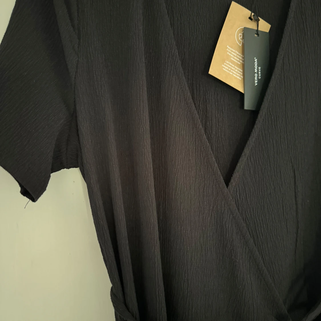 Svart omlottklänning från Vero Moda med korta ärmar och knytband i midjan. Klänningen har en v-ringad hals och är tillverkad i ett lätt, strukturerat tyg.