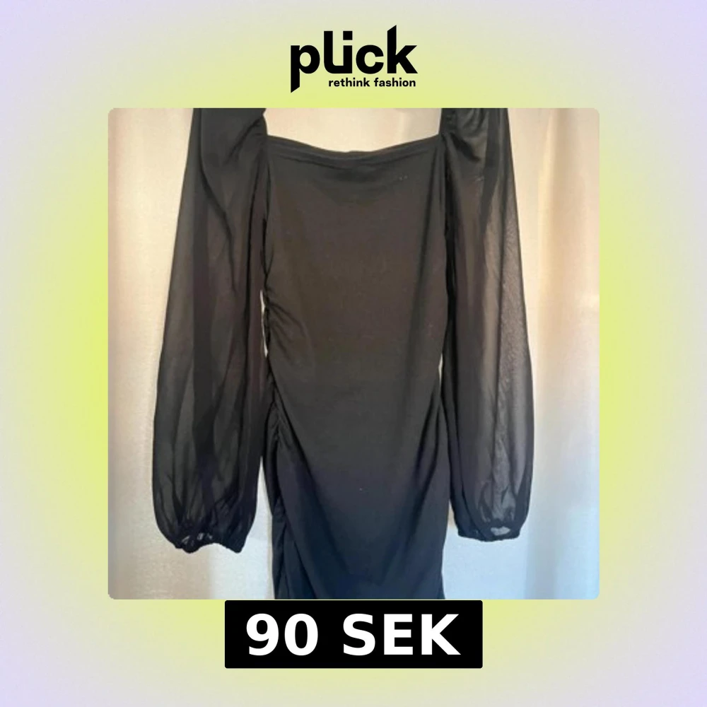 Elegant svart klänning med långa, transparenta ärmar och fyrkantig urringning. Perfekt för en stilren look.