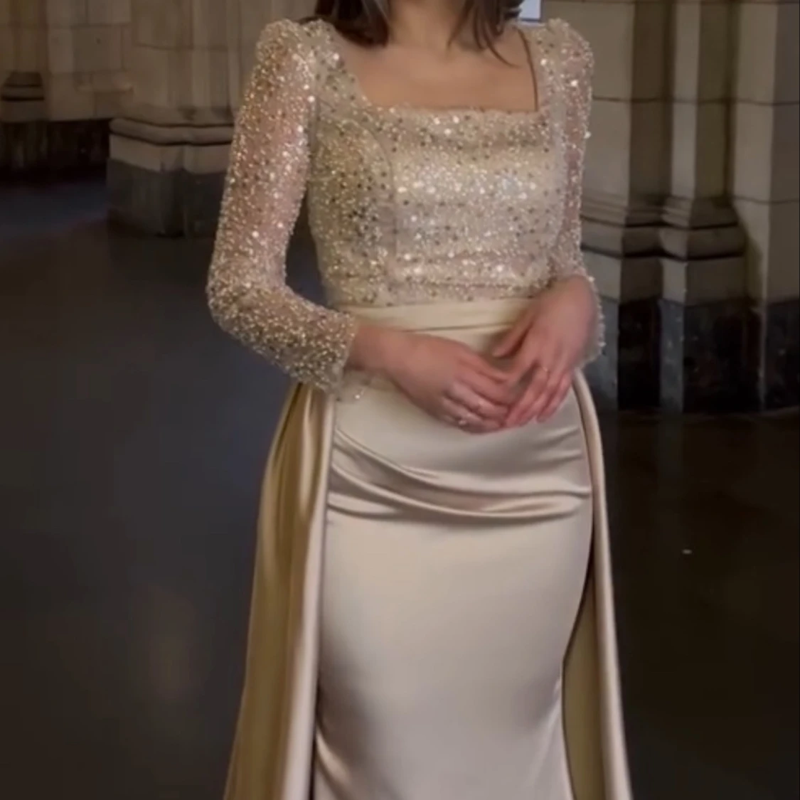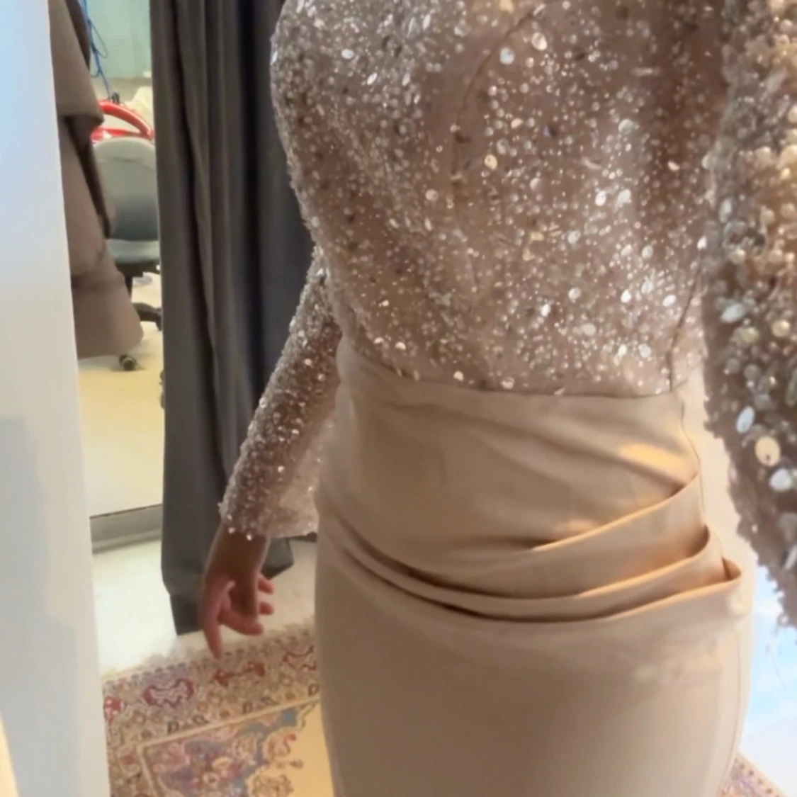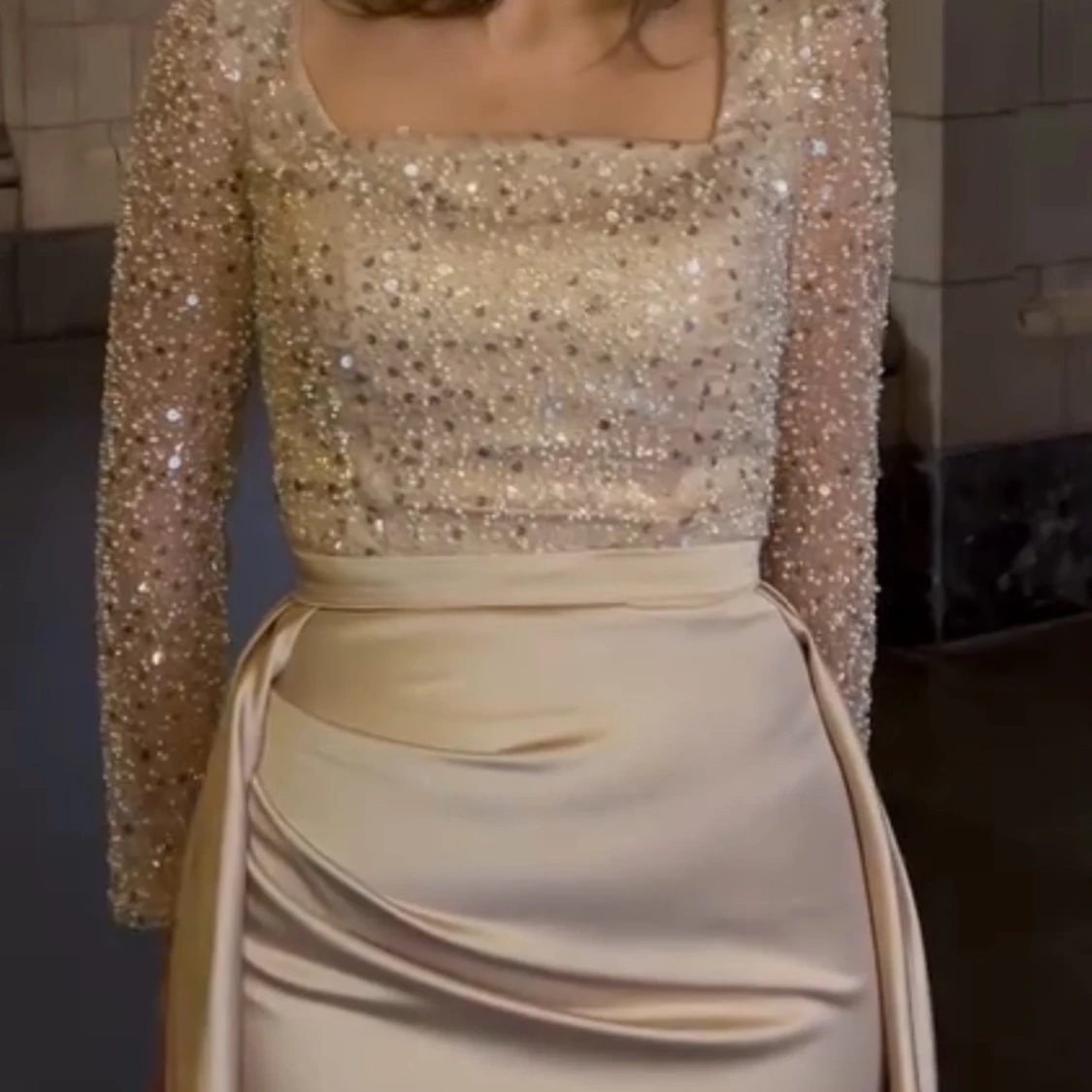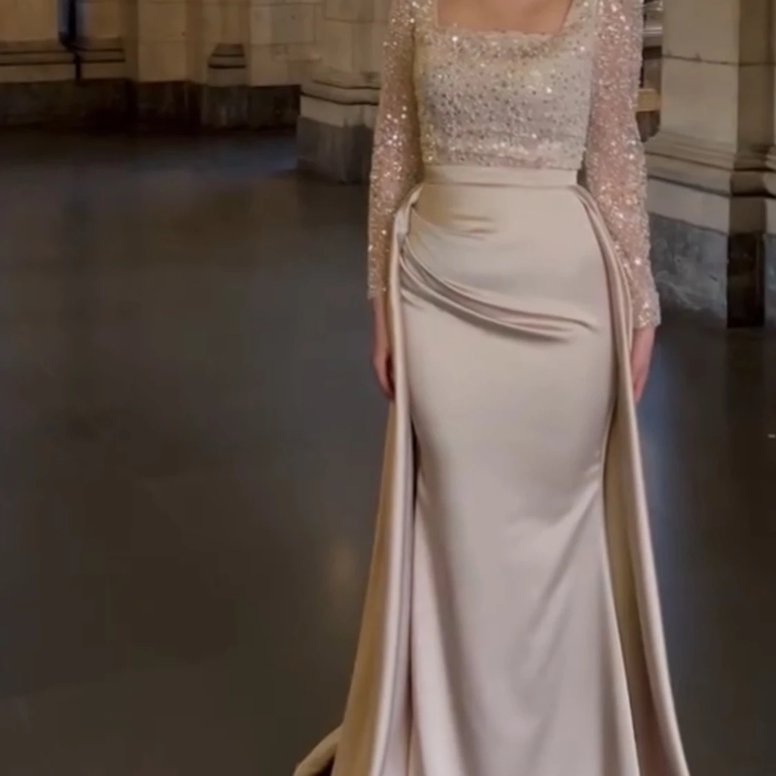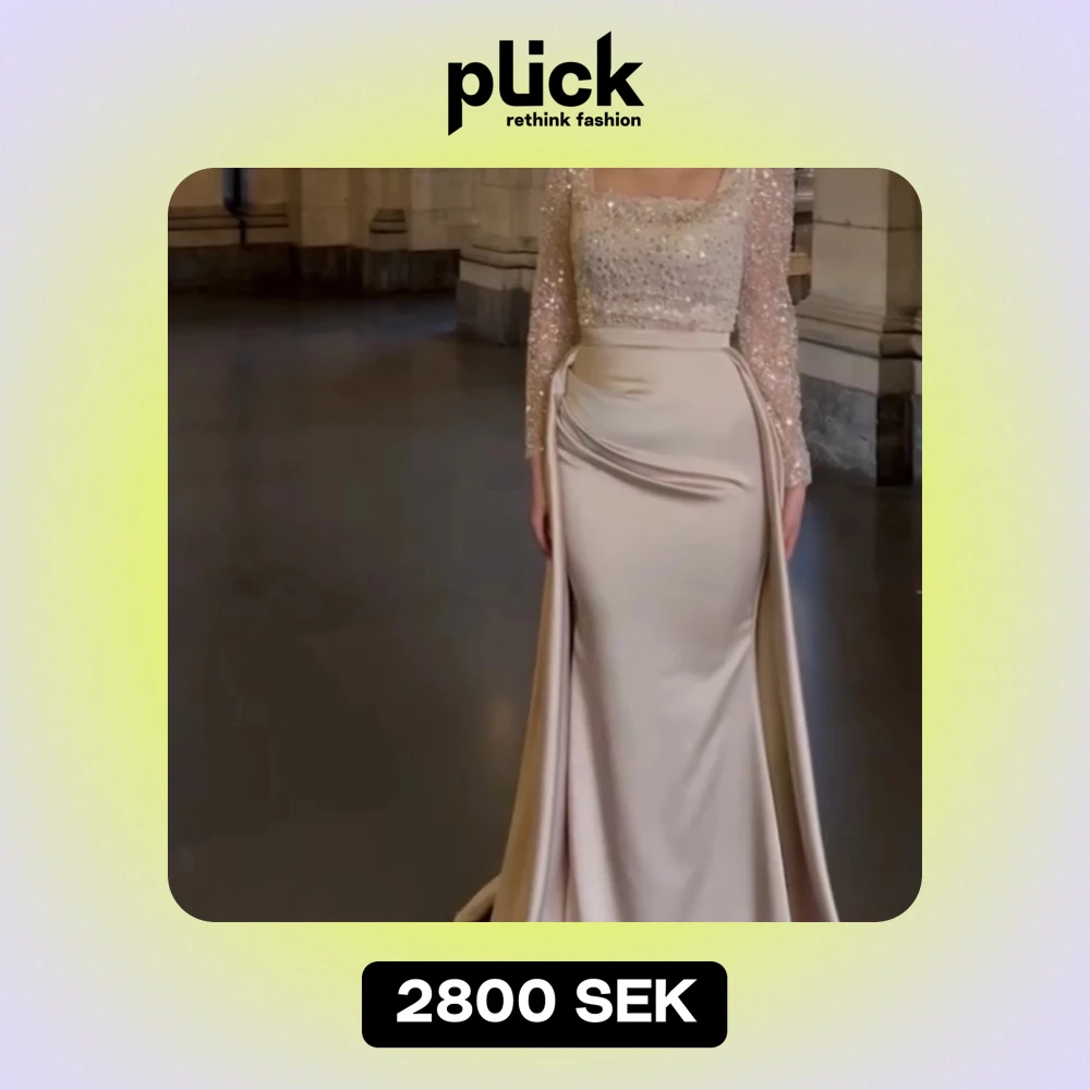 En helt ny långklänning i champagnefärg med glittrande paljetter på överdelen. Passar balen. Priset kan diskuteras☺️ Klänningen har långa ärmar och en figurnära passform som ger en lyxig känsla. Perfekt för festliga tillfällen som bröllop eller bal. Materialet är satin, vilket ger en fin lyster. Flera bilder finns de bara o fråga💕