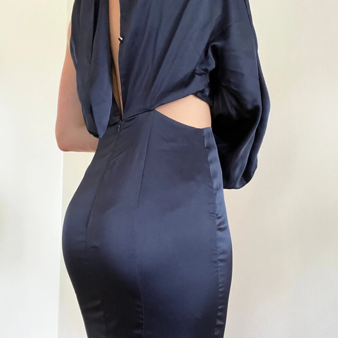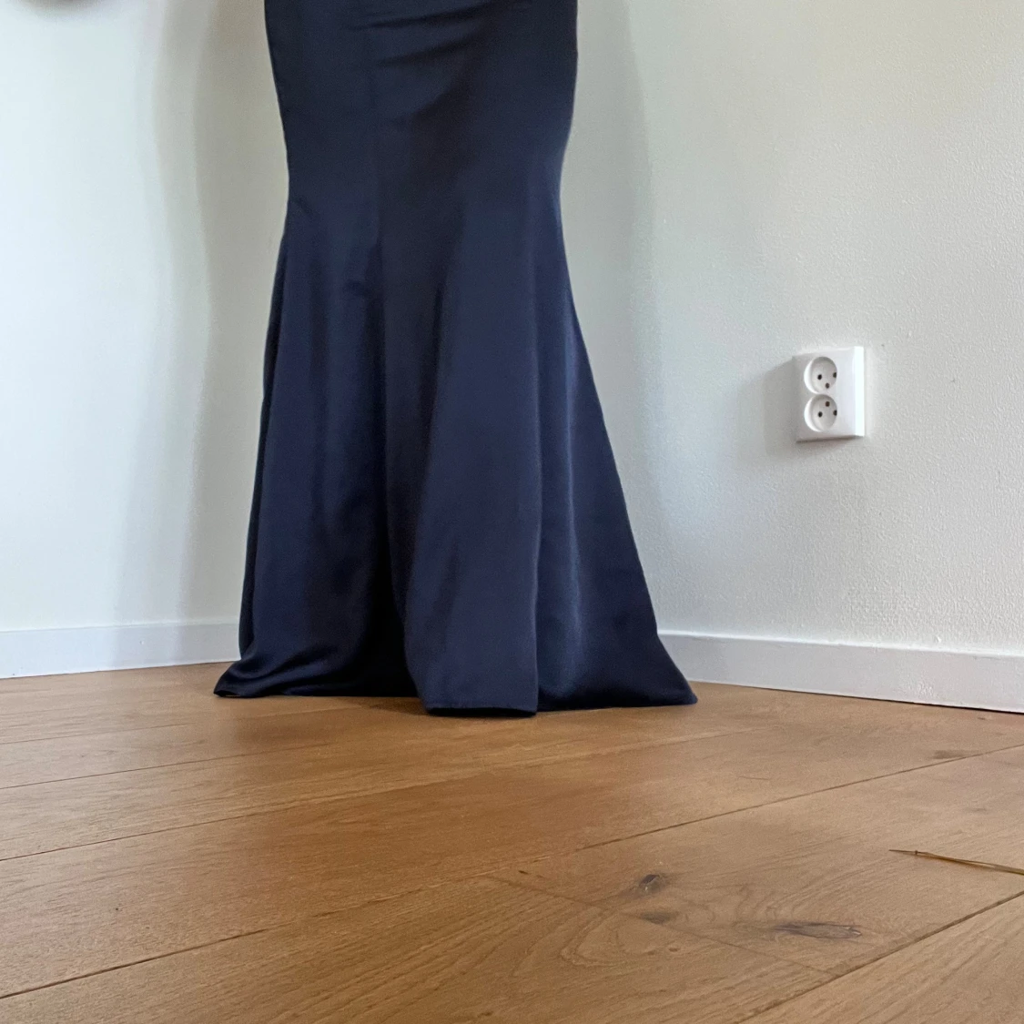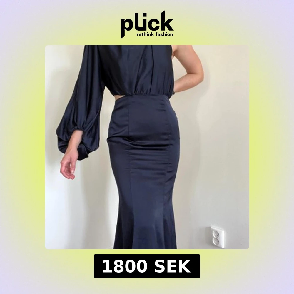 Snygg marinblå långklänning i glansigt material med en ärm och oneshoulder-design. Klänningen har ballongärm, markerad midja och cutout i sidan samt öppen rygg. Figurnära passform upptill och utsvängd nertill, perfekt för dig som vill sticka ut. Säljer då storleken inte passar mig längre och jag behöver köpa en ny