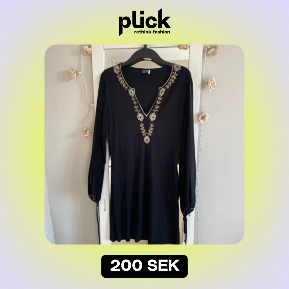 Säljer en elegant svart klänning från Add i t i storlek 38/40. Klänningen har vackra broderade detaljer i guld och silver runt den v-ringade halsen. Den är långärmad med knytband vid ärmsluten för en extra touch. Perfekt för festliga tillfällen!