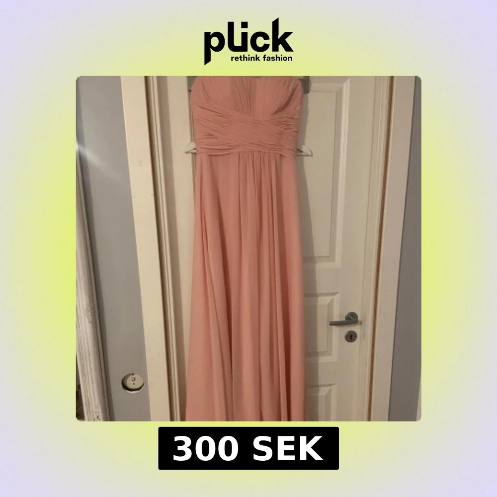 Säljer en romantisk ljusrosa långklänning med axelbandslös design och vackra draperade detaljer över bysten. Klänningen har snörning i ryggen för perfekt passform och ett mjukt, flytande tyg som ger en elegant siluett. 😊