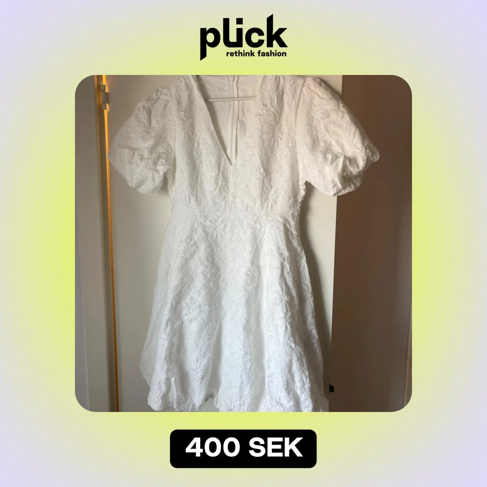 Säljer en superfin vit klänning med v-ringning och puff ärmar. Den har ett tjockt skönt material perfekt till midsommar/ student. Endast provat på. Lappen är av så är därför osäker vart den är köpt.