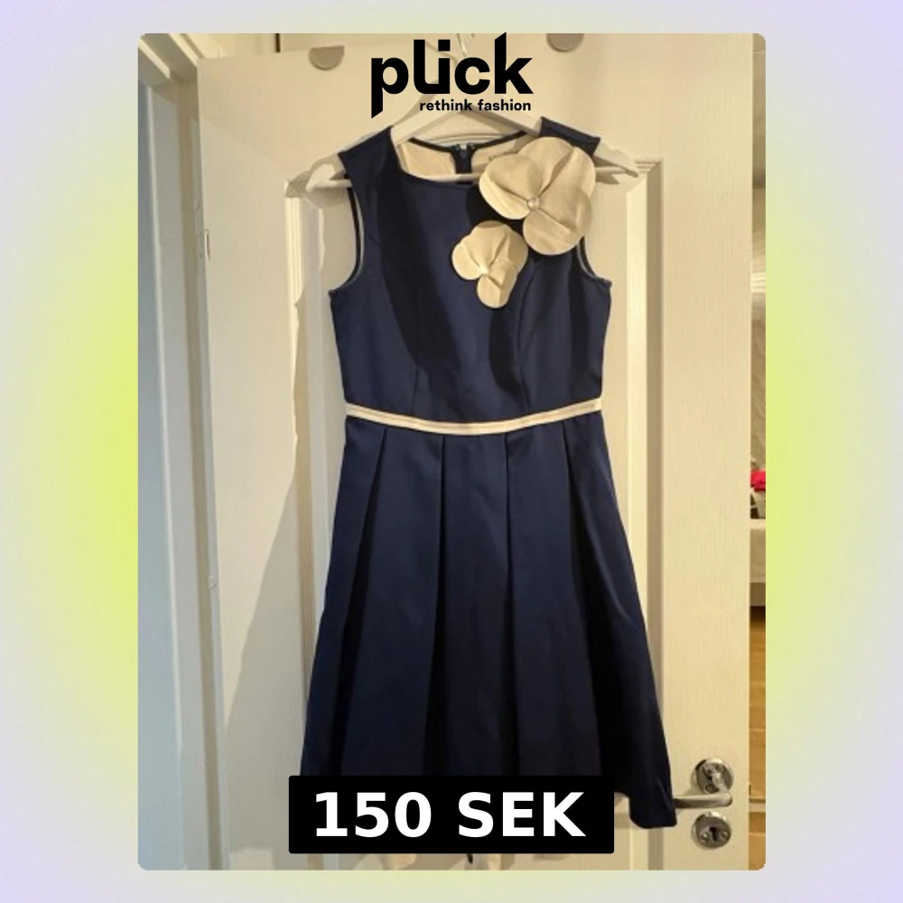 Snygg marinblå klänning från Karen Millen med krämvita detaljer och stora dekorativa blommor vid axeln. Klänningen är ärmlös, har rund hals och ett krämvitt band i midjan. Materialet är glansigt och känns lyxigt, perfekt för dig som vill sticka ut.