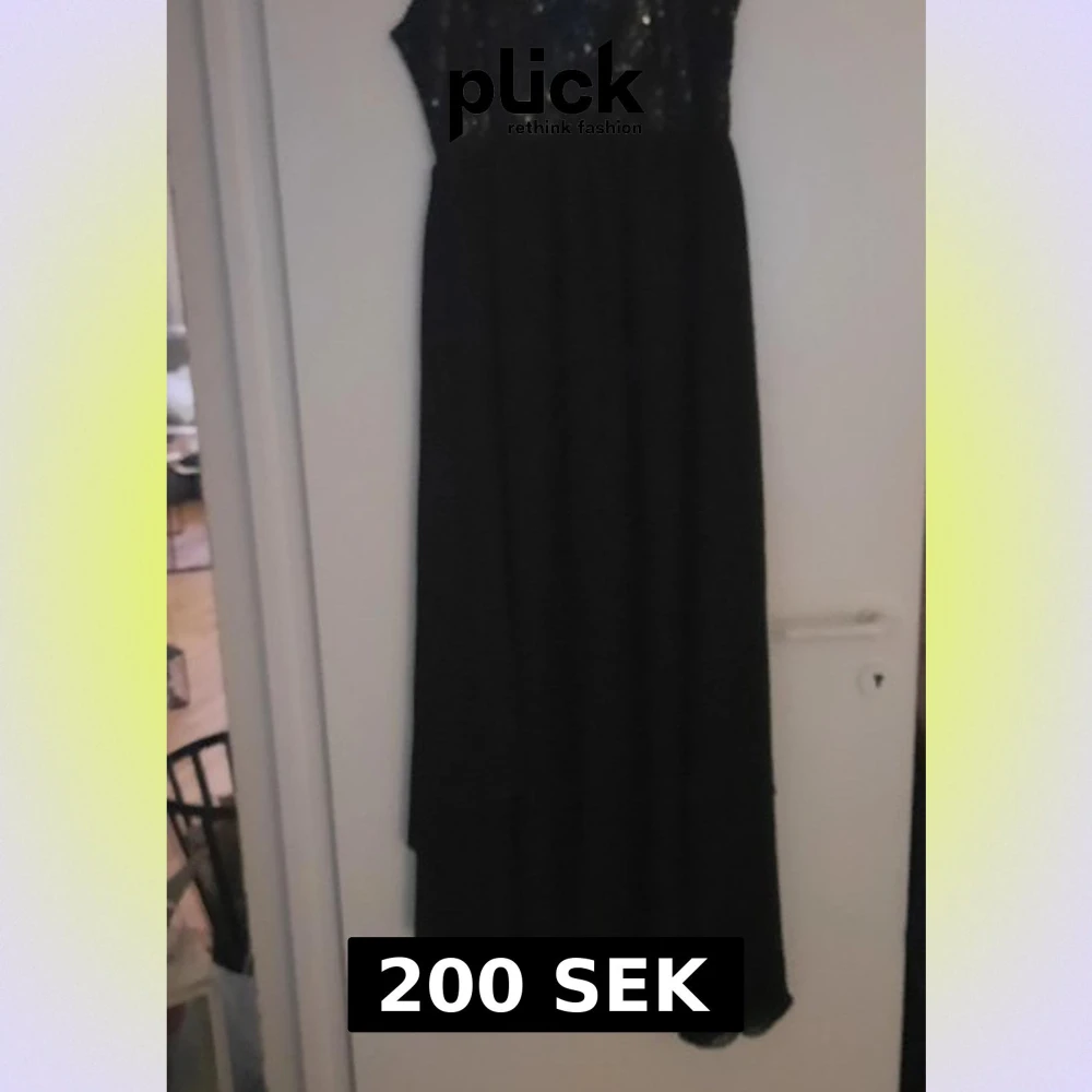 Svart långklänning från Paris Kate & I i storlek 38. Överdelen är täckt med glittriga paljetter som ger en snygg och festlig look, medan kjolen är enkel och faller mjukt. Klänningen är ärmlös och har rundad urringning. Perfekt för dig som vill sticka ut.