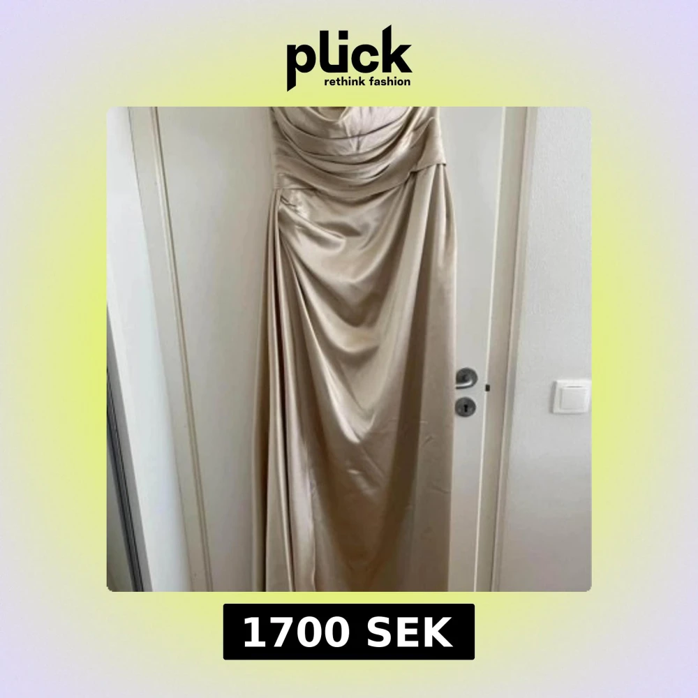 Elegant champagnefärgad långklänning med draperad överdel och v-ringning. Perfekt för festliga tillfällen.
