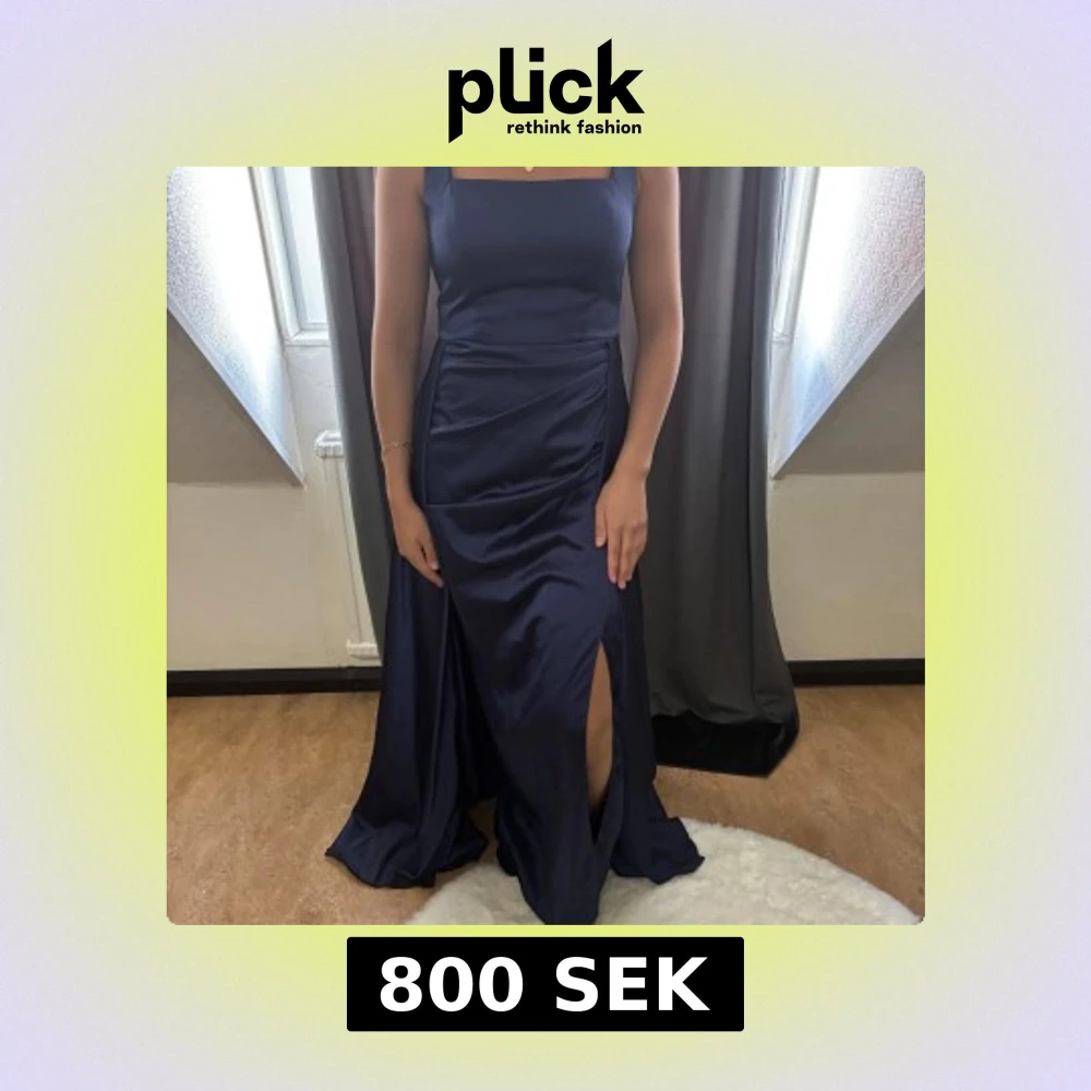 Elegant marinblå långklänning i glansigt material med breda axelband och fyrkantig urringning. Klänningen har en snygg slits framtill och en figurnära överdel som övergår i ett svepande kjolparti. Perfekt för bal eller festliga tillfällen.