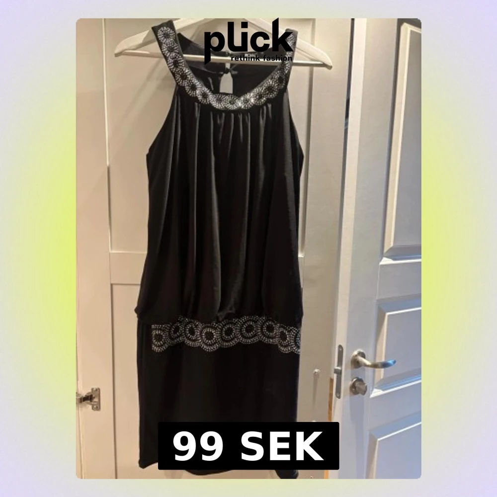 Snygg svart klänning från Bodyflirt i storlek 38. Klänningen har ärmlös design med glittriga detaljer vid halsringningen och midjan. Den har en avslappnad passform och är perfekt för dig som gillar att sticka ut med lite extra bling.