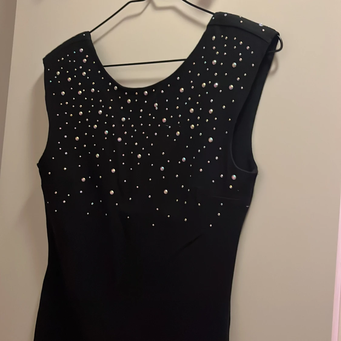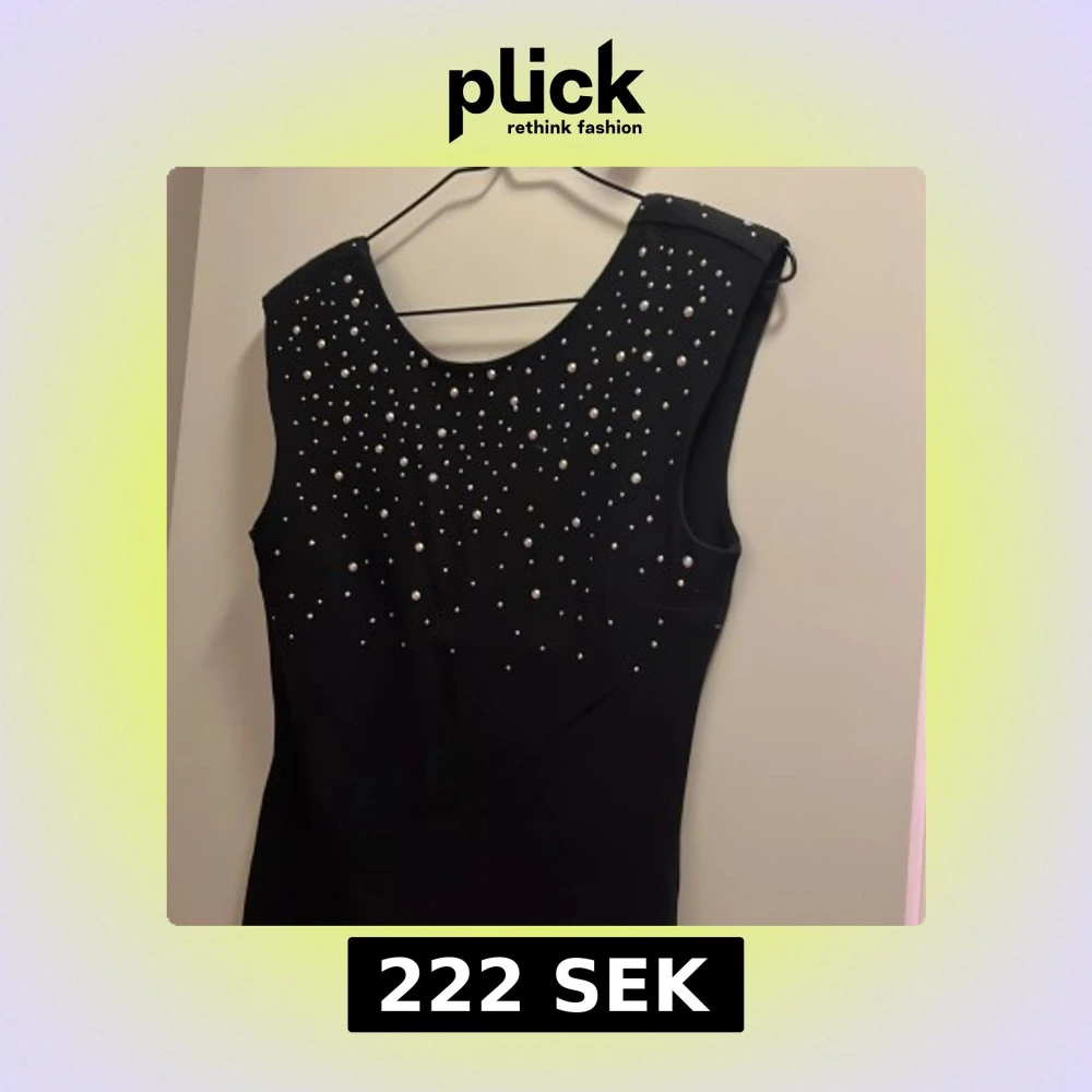 Svart ärmlös klänning med rund halsringning och glittrande pärlor över hela överdelen. Snygg och stilren design som ger en lyxig känsla. Perfekt för dig som vill sticka ut med elegans och coola detaljer.