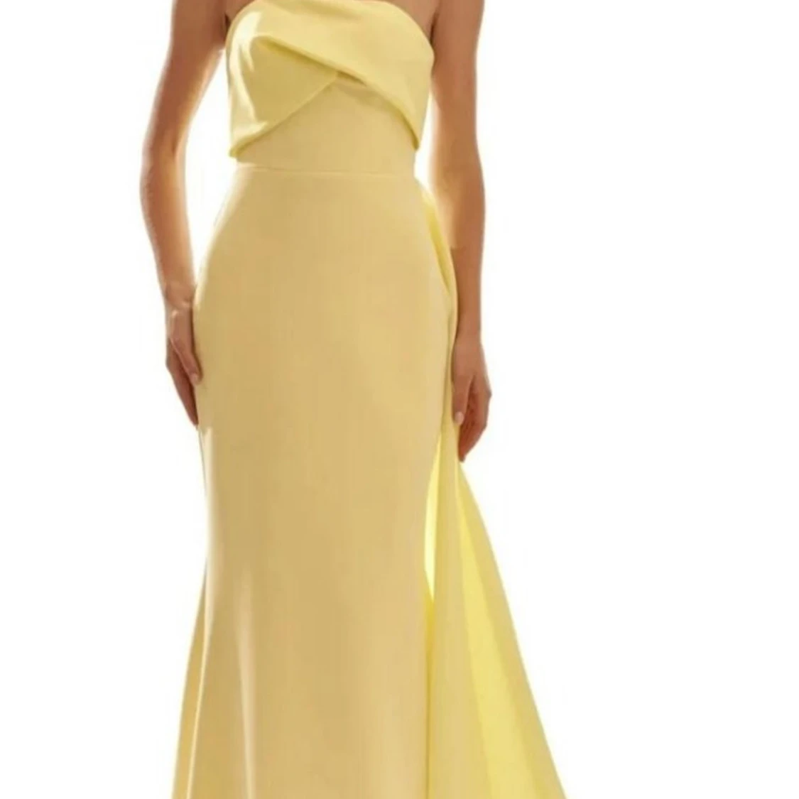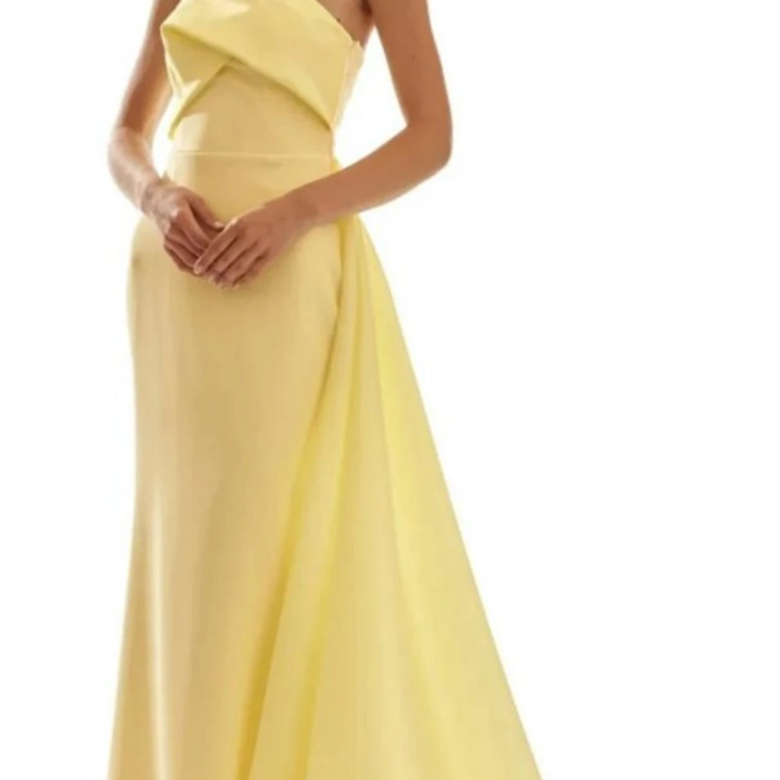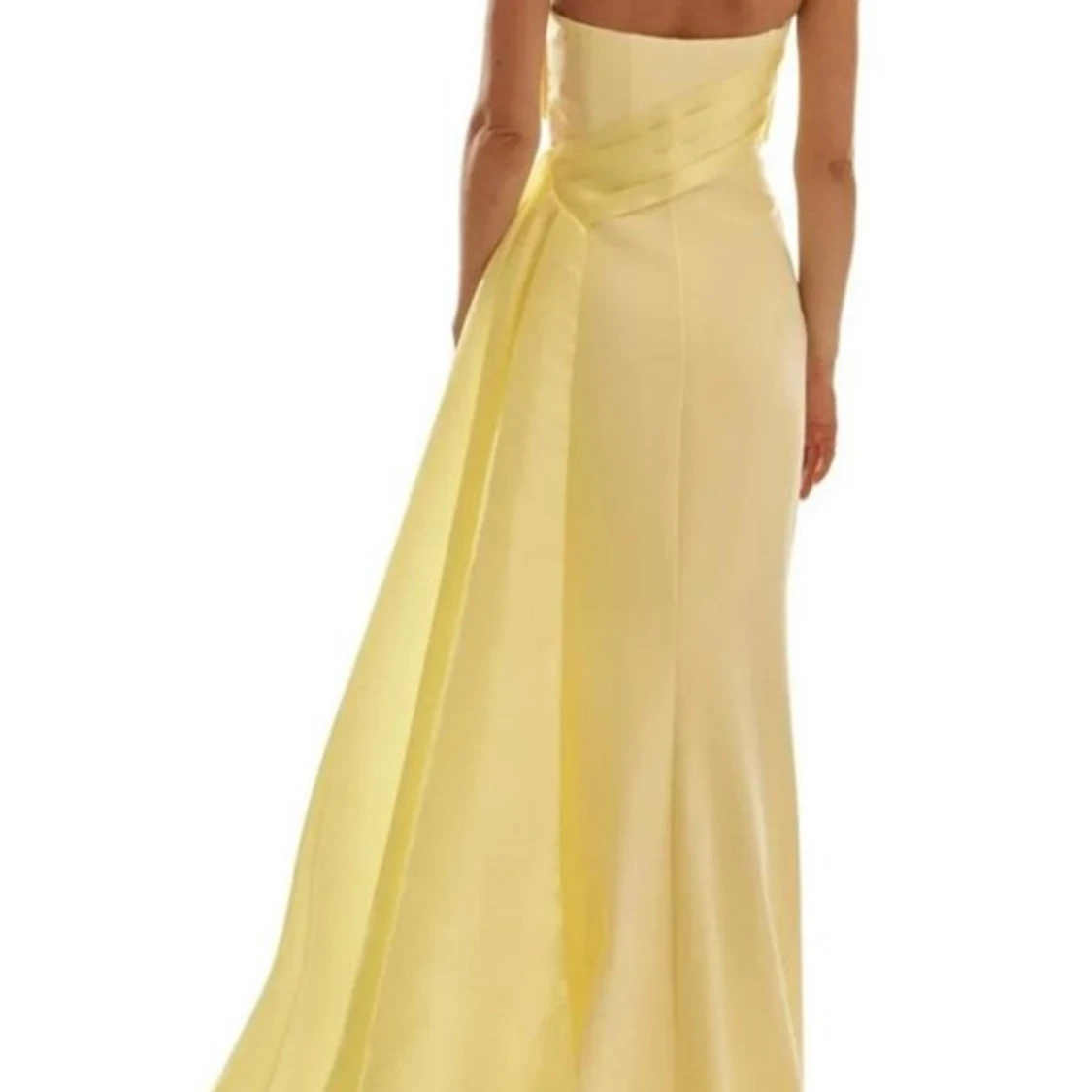 Superfin ljusgul långklänning med axelbandslös design och elegant drapering över bysten. Klänningen har en figurnära passform och ett långt släp baktill som ger en riktigt lyxig känsla. Perfekt för dig som vill sticka ut med en fräsch och somrig look. Den är i storlek 38 men har minakat den till 36 men det går att sprätta upp. Nypris:3800kr