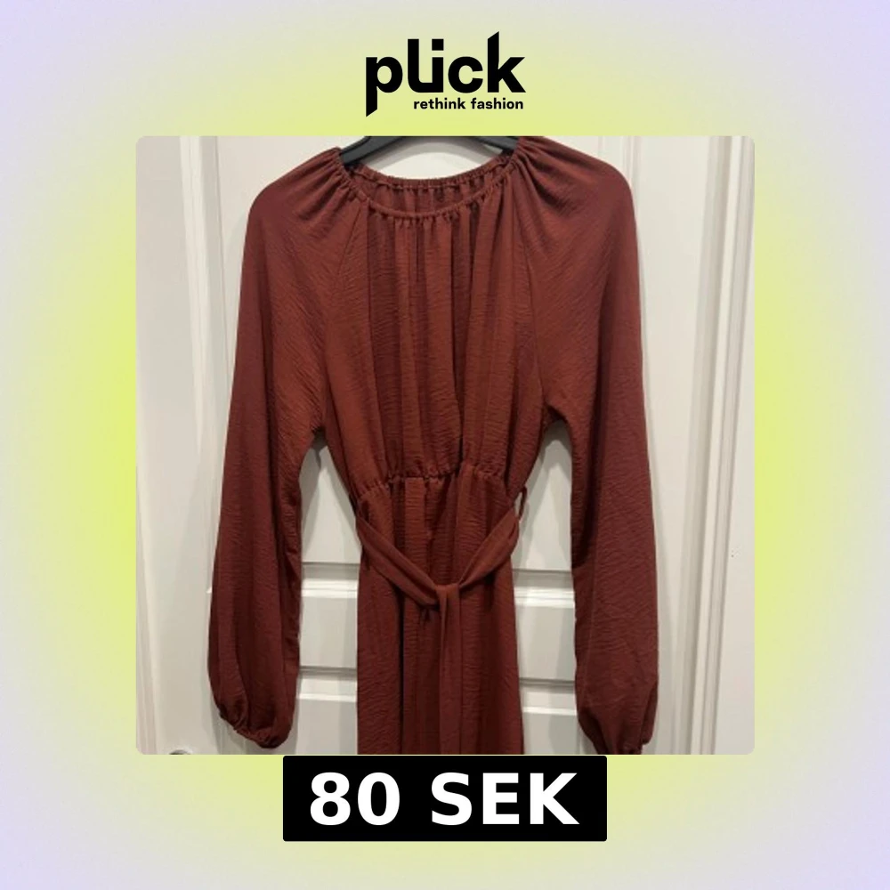 Snygg rostbrun klänning med långa ärmar och markerad midja med knytbälte. Klänningen har en avslappnad passform och lätt rynk vid halsringningen. Perfekt för dig som gillar en enkel men trendig look.