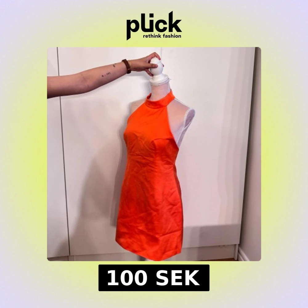 Snygg orange kortklänning med halterneck och öppen rygg. Klänningen har en figurnära passform och är tillverkad i ett glansigt material som ger en cool look. Perfekt för dig som vill sticka ut med färg och stil.