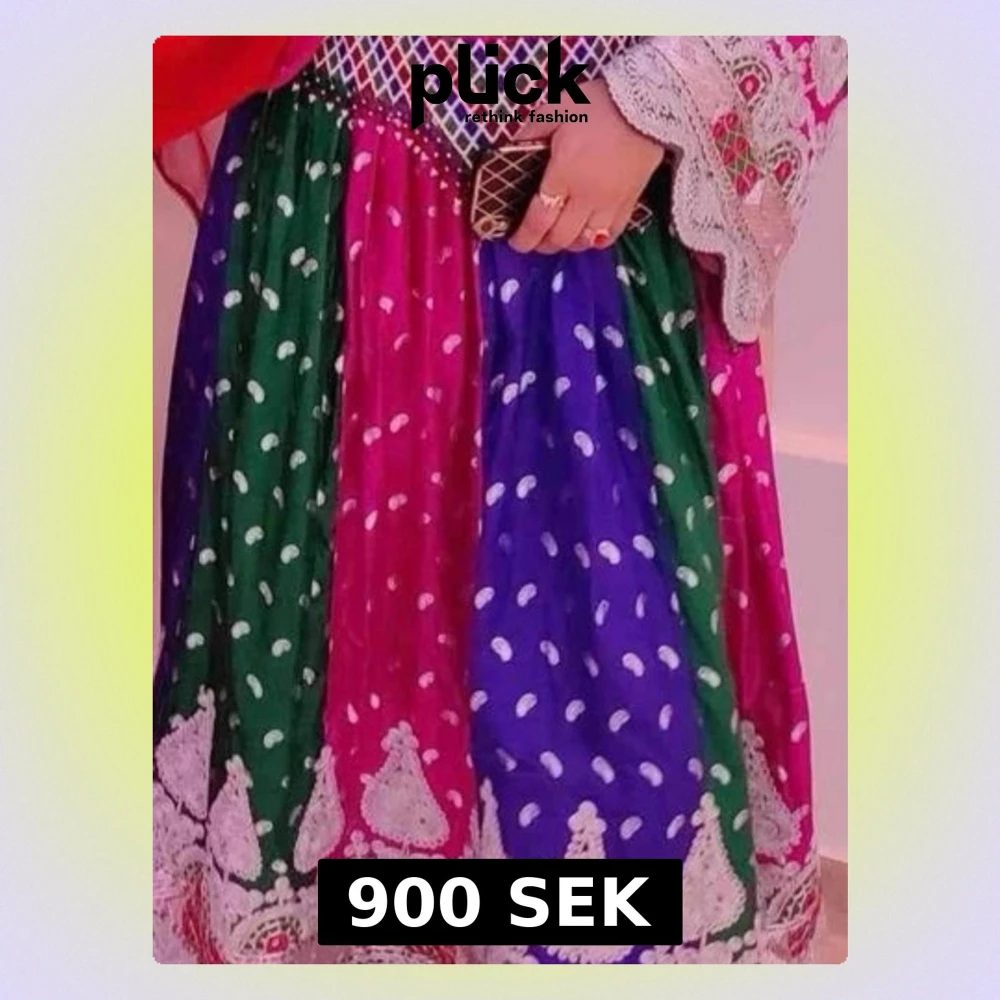 Säljer en afghansk dräkt, långklänning i starka färger med gröna, blå och rosa paneler. Klänningen har vita prickar, detaljerad brodyr nertill och ett mönstrat liv med speglar och broderier. Ärmarna har spets och klänningen är i ett lätt, glansigt material. Standard stl. Använd 1 gång. Egendesignad och syd i Kabul. Har sjal och byxor till.