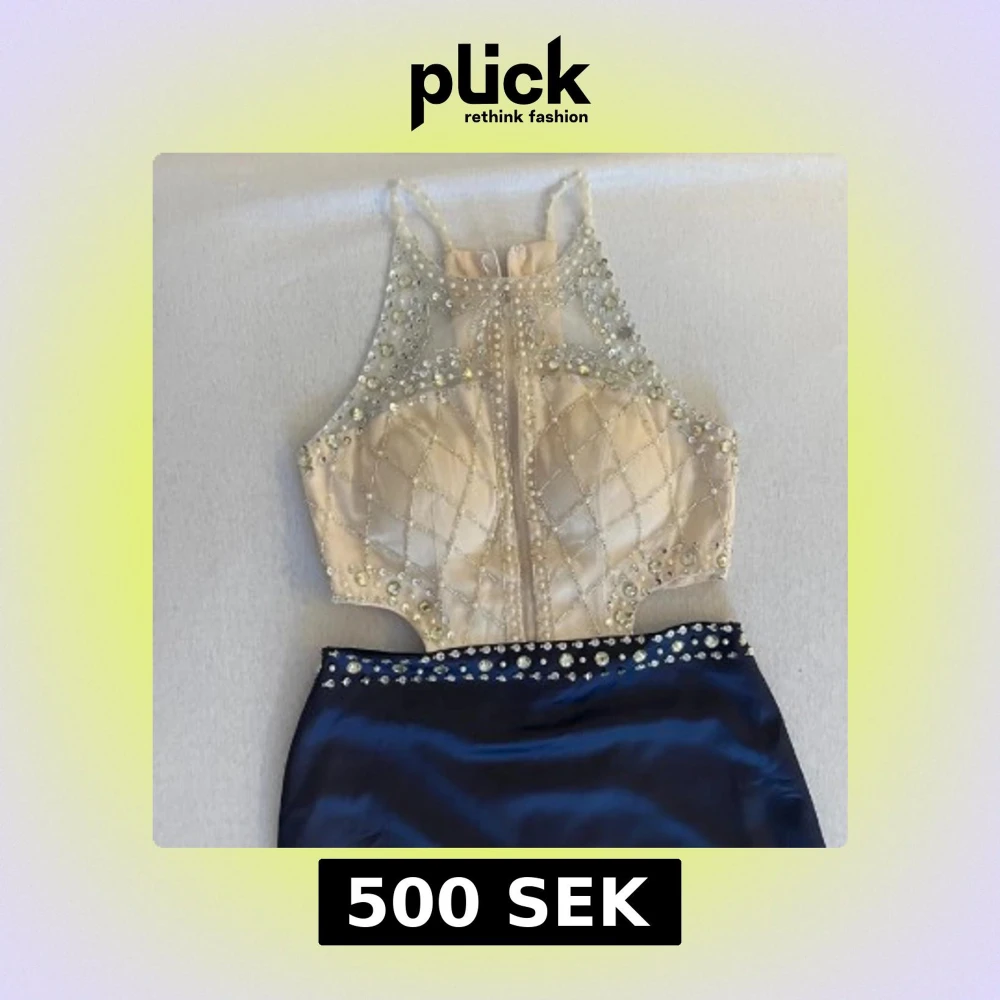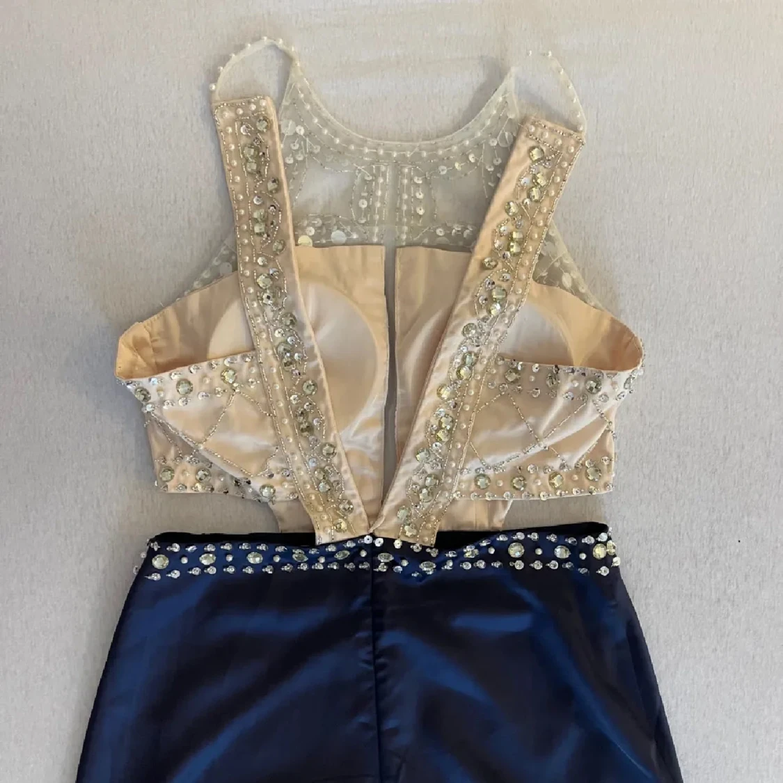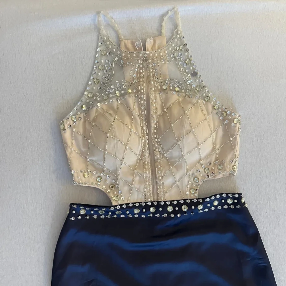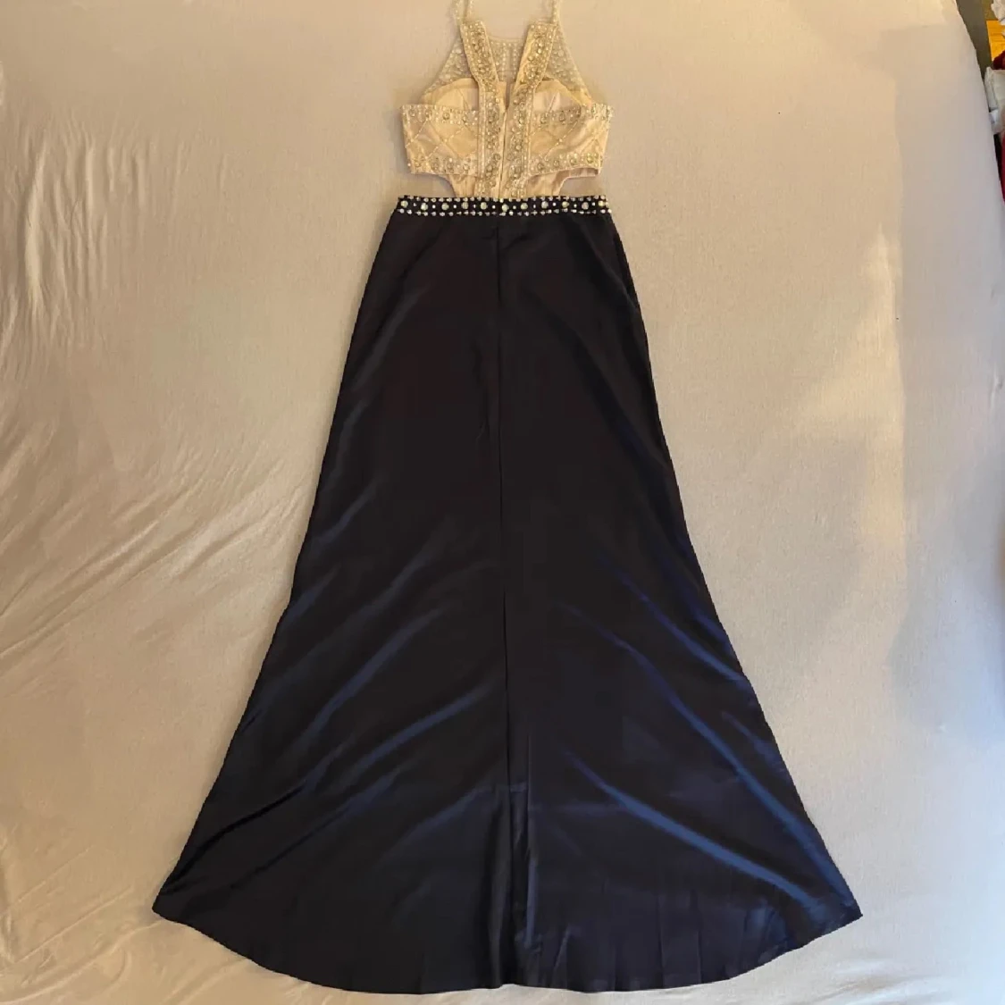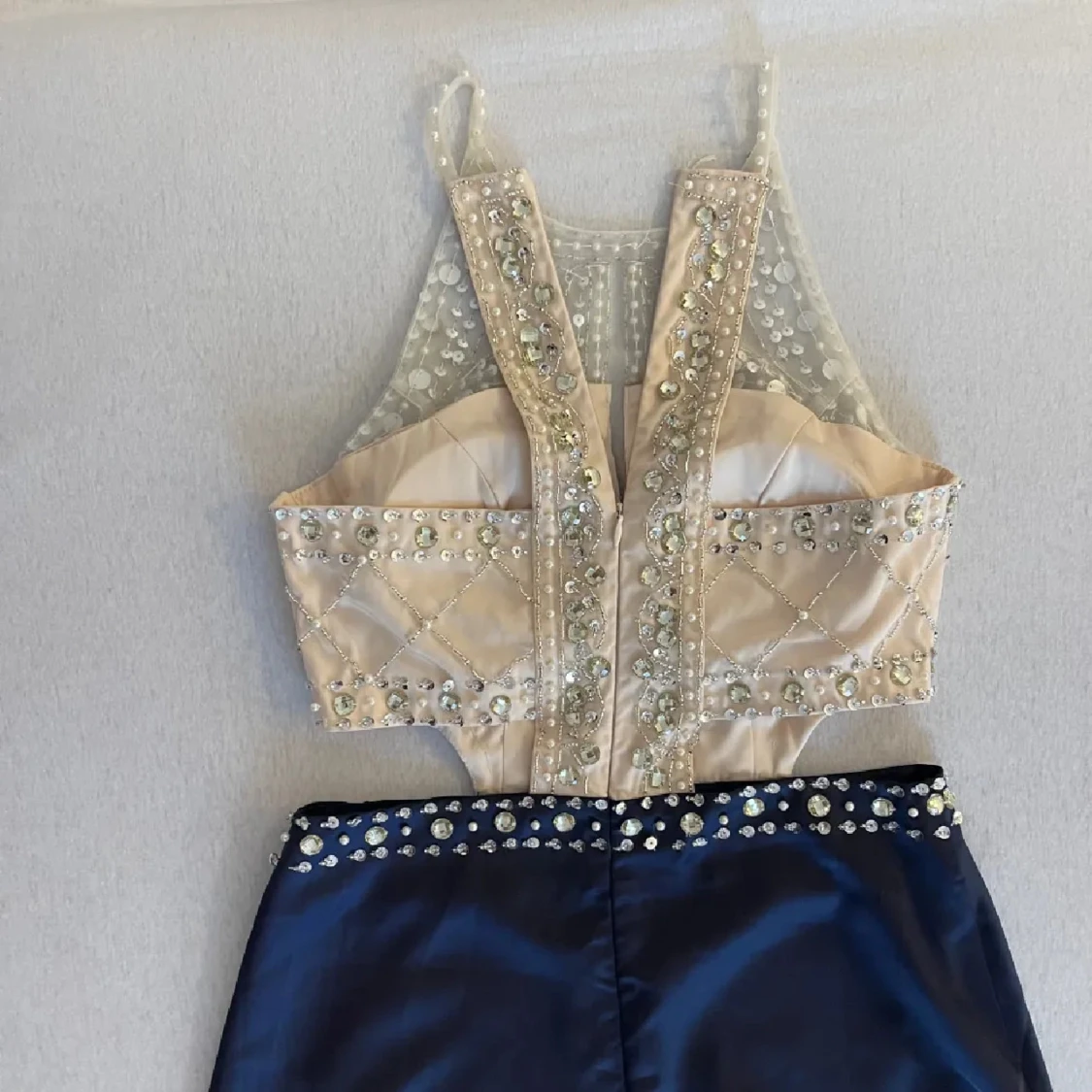 Supersnygg långklänning med marinblå satinkjol och en champagnefärgad topp dekorerad med pärlor och glittriga stenar. Toppen har meshdetaljer och markerad midja med stenar längs linningen. Perfekt för bal eller festkväll!