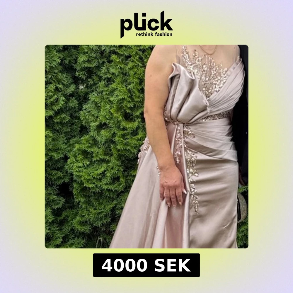 Säljer en elegant långklänning i champagnefärgad satin med glittriga paljettdetaljer och broderier upptill. Klänningen har offshoulder-ärmar, draperad design och vacker volang vid axeln. Perfekt för bal eller fest, ger en lyxig och glamorös känsla.
