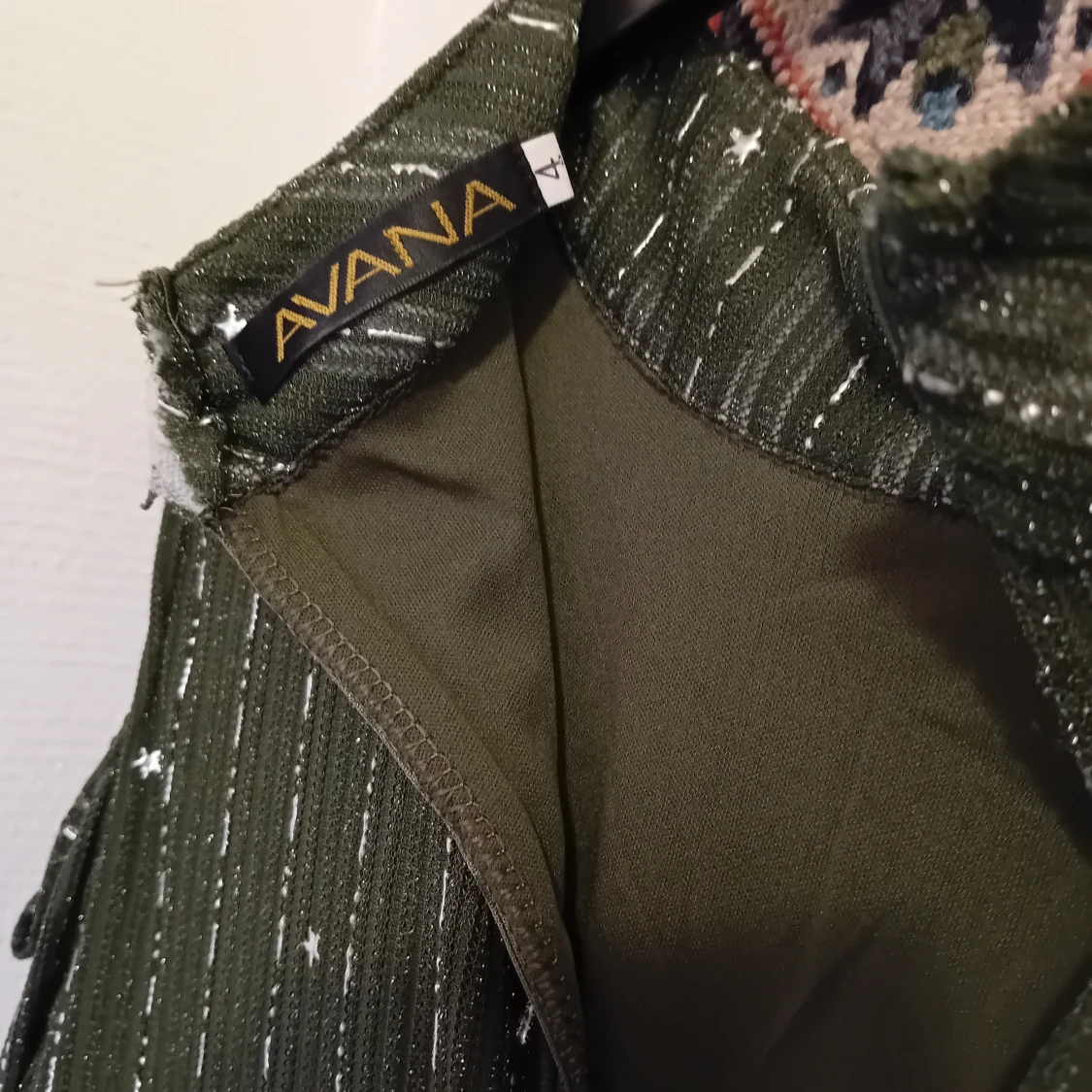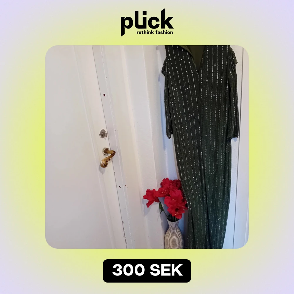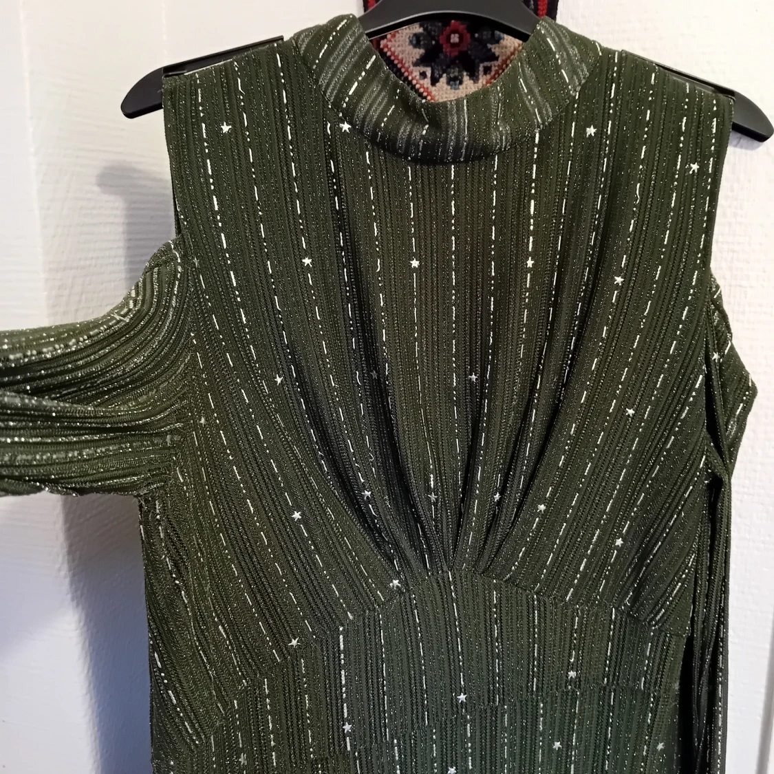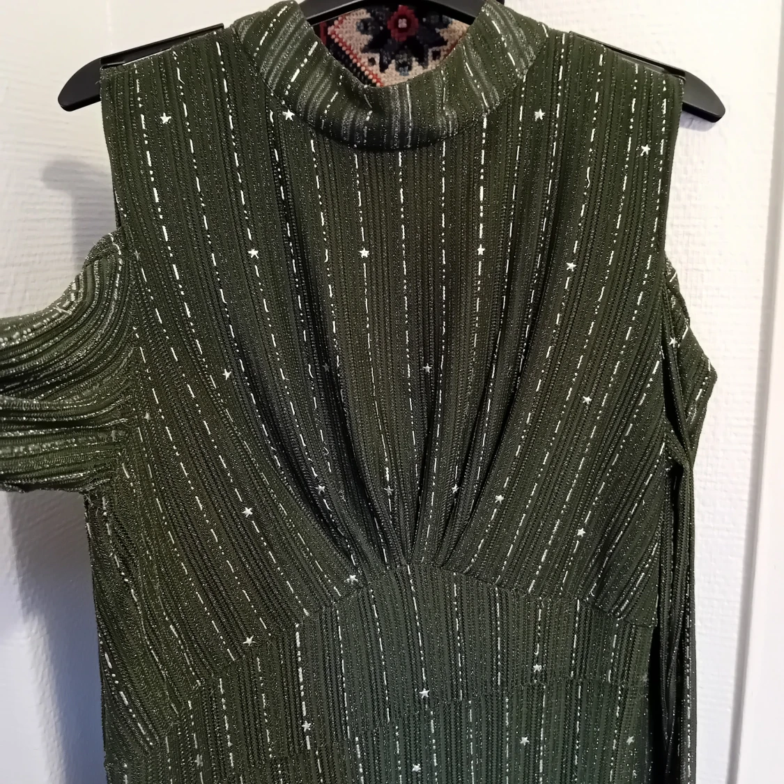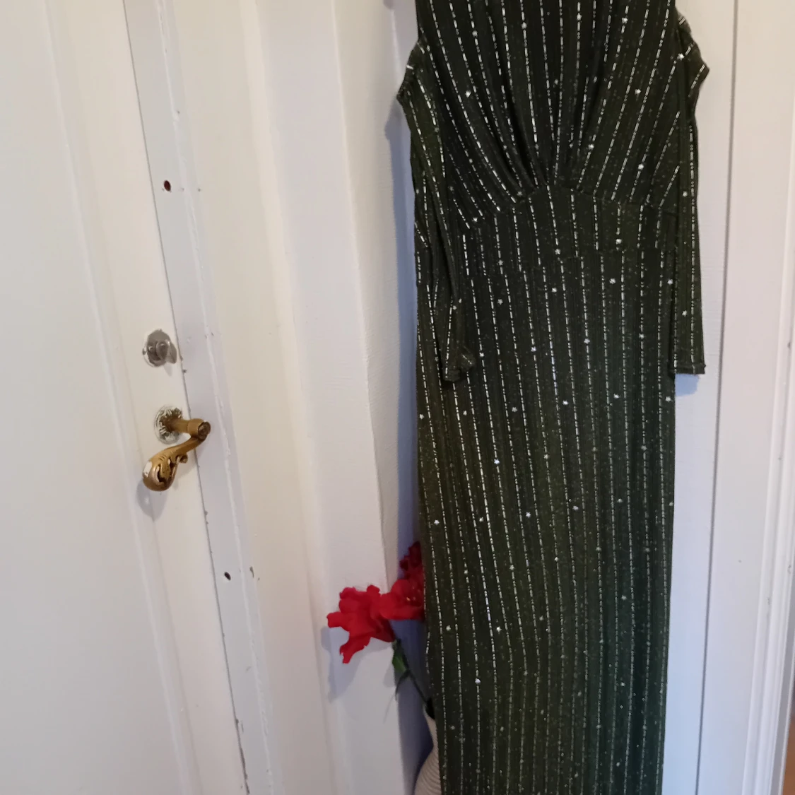 Säljer en superfin grön långklänning från Avana i storlek S. Klänningen har ett glittrigt randigt mönster och en elegant öppen axeldesign. Perfekt för festliga tillfällen! 💚✨