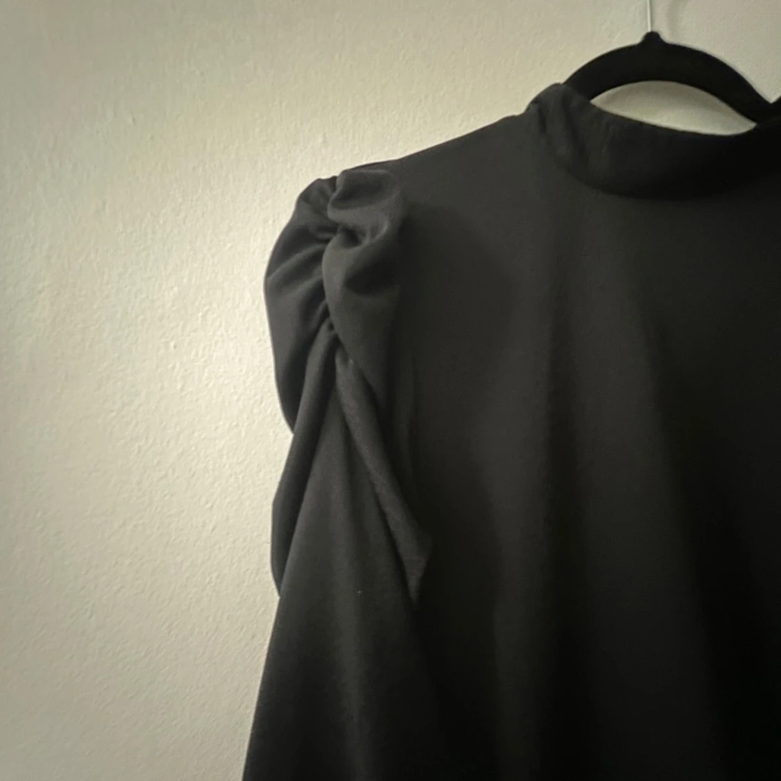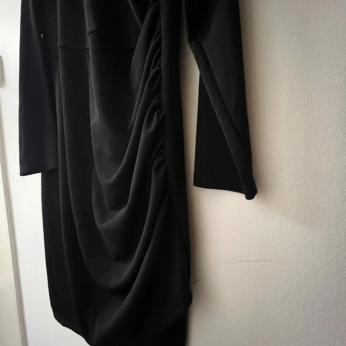 Säljer en elegant svart klänning med långa ärmar och en hög hals. Klänningen har snygga rynkdetaljer på sidan som ger en fin form.