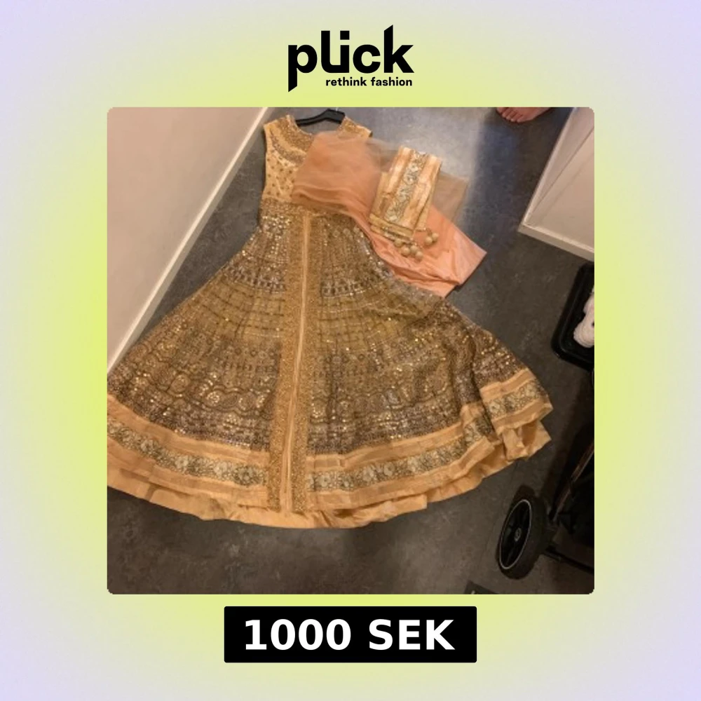 Superfin långklänning i champagnefärg med glittriga paljettdetaljer och broderier. Ärmlös modell med rund halsringning och vidd i kjolen. Klänningen har vackra mönster och medföljer matchande sjal i tunn tyll. Perfekt för dig som vill sticka ut med en elegant look.