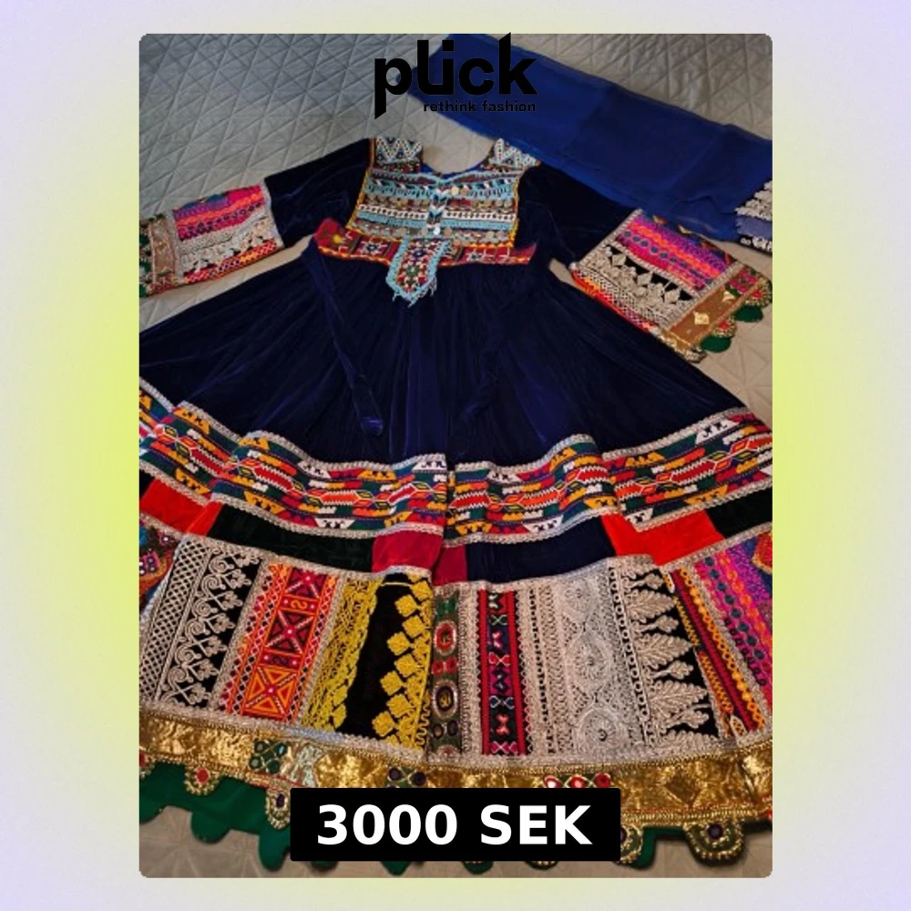 Afghansk marinblå långklänning med färgstarka broderade detaljer och mönster i rött, gult, grönt och silver. Klänningen har långärmade ärmar och är dekorerad med glittriga och broderade inslag, samt guldfärgade kanter. Materialet är sammet och klänningen har en traditionell, festlig look.