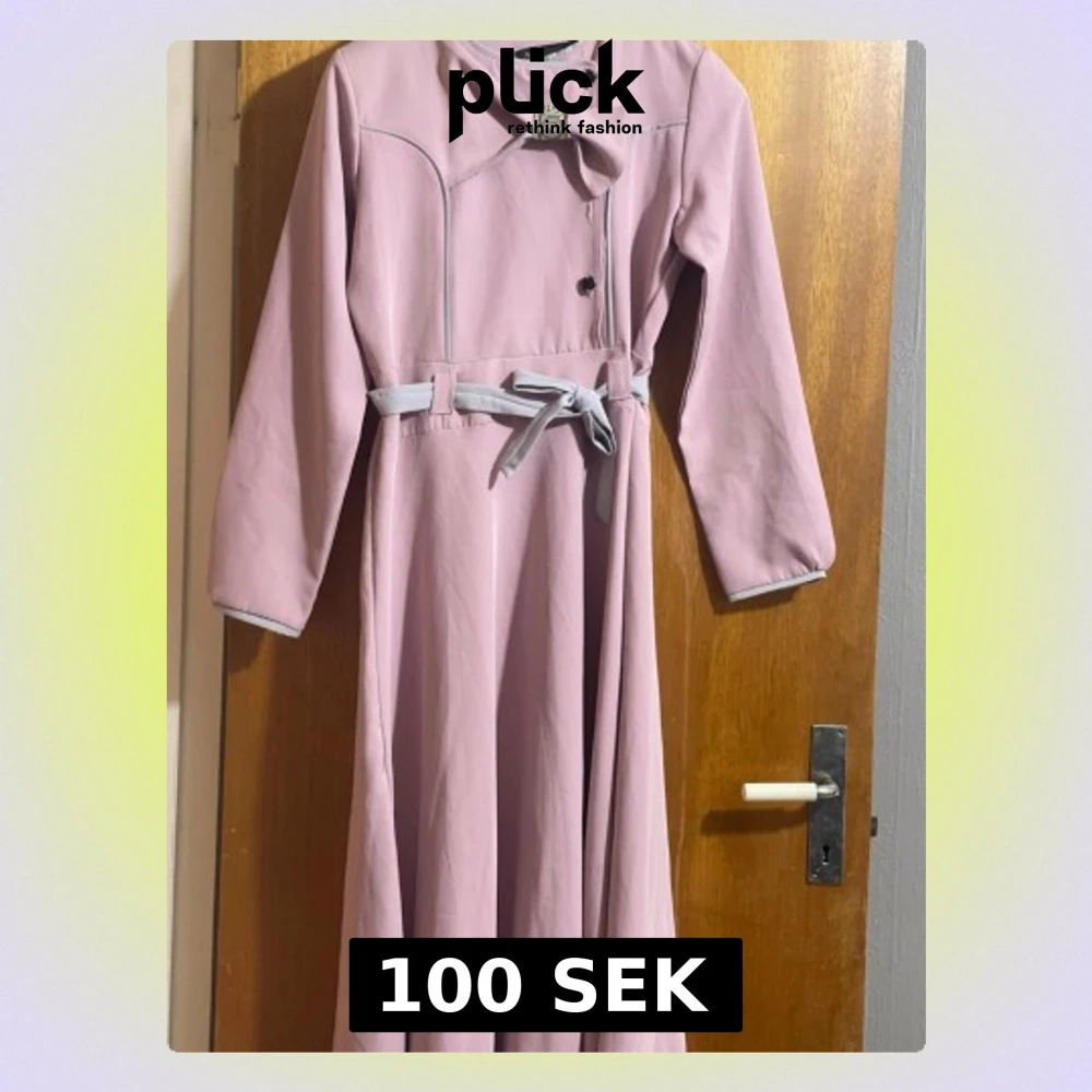 Säljer en elegant ljusrosa långklänning med markerad midja och knytbälte i kontrasterande grått. Klänningen har långa ärmar, dekorativ rosett med strassdetalj vid halsen och knappar framtill. Perfekt för dig som gillar en chic och modest stil.