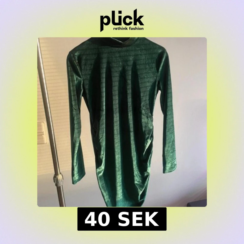Mörkgrön sammetsklänning med lång ärm och rak passform. Klänningen har en enkel design utan synliga detaljer och slutar strax ovanför knäna. Perfekt för dig som gillar en stilren look med lite lyxig känsla.