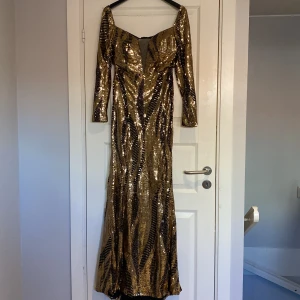 Säljer en fantastisk guldglittrig långklänning med långa ärmar och djup v-ringning. Klänningen har ett iögonfallande mönster i svart och guld som verkligen sticker ut. Och även en dragkedja där bak. Perfekt för en glamorös kväll!
