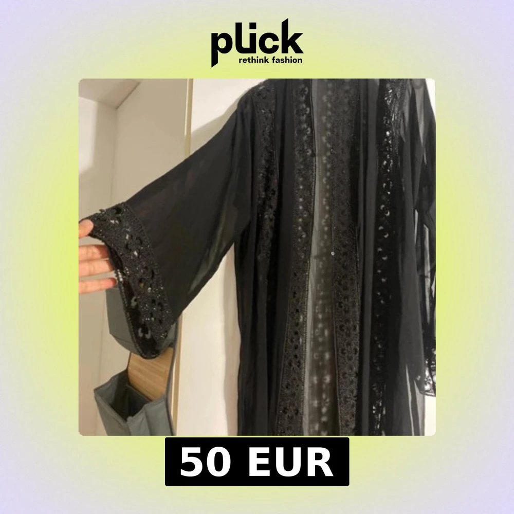 Elegant svart abaya med långa ärmar och vackra spetsdetaljer längs kanterna och ärmsluten. Perfekt för att lägga till en touch av stil till din outfit. Size: 56, fits 40 size