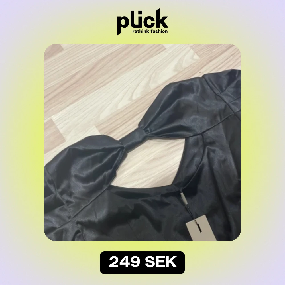 Säljer en elegant svart klänning med en stor rosett vid halsen. Klänningen har en öppen rygg och är tillverkad i ett glansigt material som ger en lyxig känsla. Perfekt för festliga tillfällen!