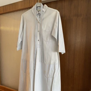 A-linjeklänning i ljust jeans. Ett par fläckar som bör gå bort i tvätt