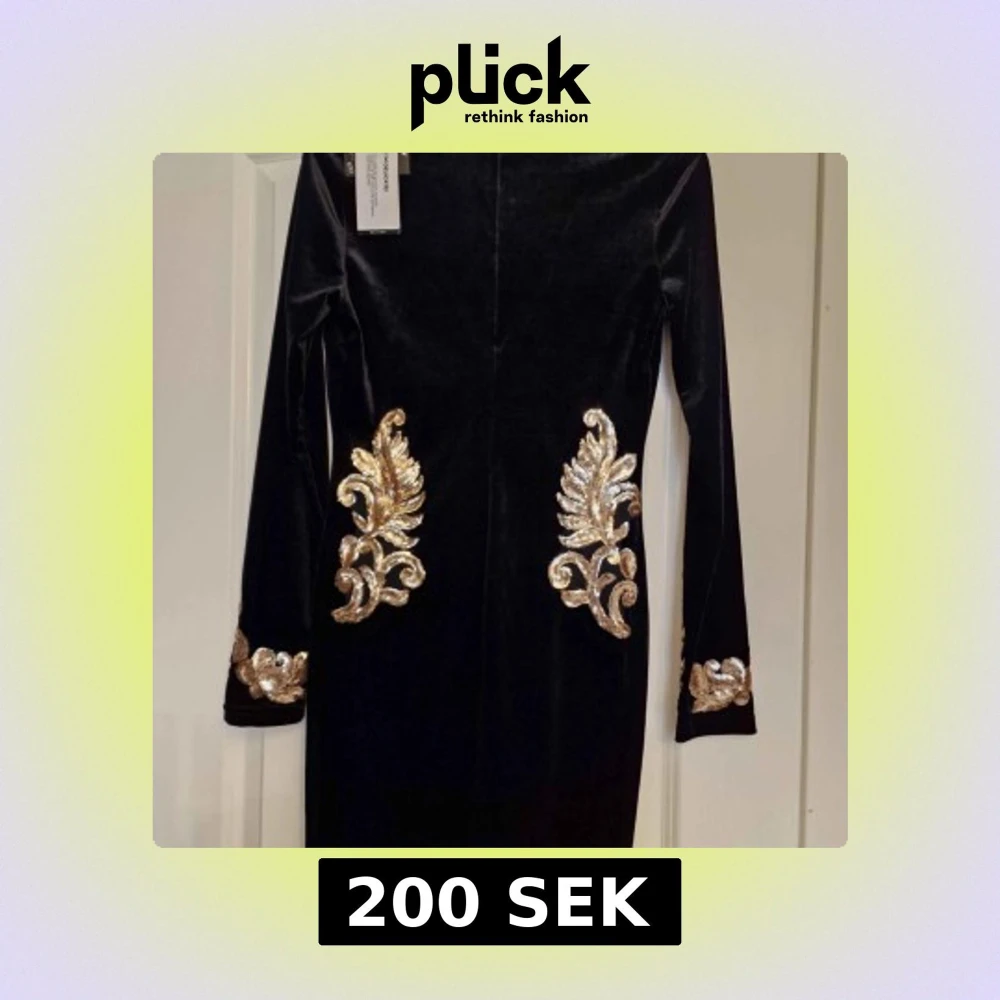Säljer en svart långärmad sammetsklänning med v-ringning och dekorativa guldiga broderier på axlar, ärmslut och sidorna av midjan. Klänningen har en figurnära passform och känns lyxig och elegant.