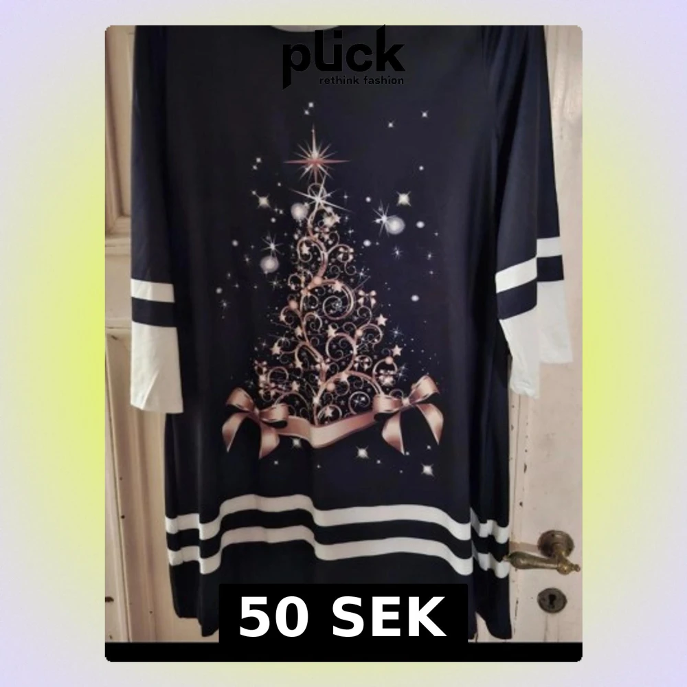 Svart långärmad klänning med vitt och champagnefärgat julgranstryck framtill, dekorerad med stjärnor och rosetter. Klänningen har vita detaljer på ärmar och nederkant samt rund halsringning. Perfekt för vinterns festligheter.