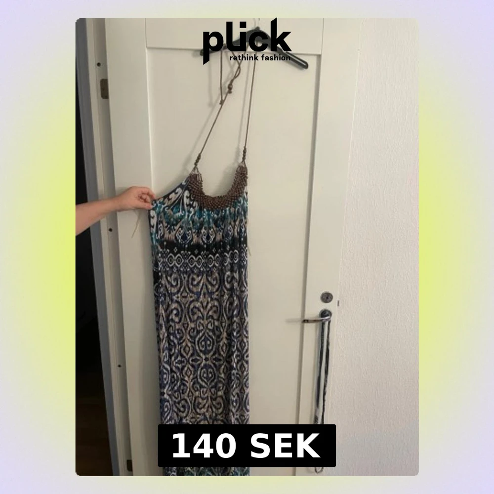 Säljer en långklänning med bohemiskt mönster i blått, beige, svart och vitt. Klänningen har tunna axelband med träpärlor och ett snyggt fall. Perfekt för sommardagar och festivaler. Materialet känns mjukt och svalt mot huden.