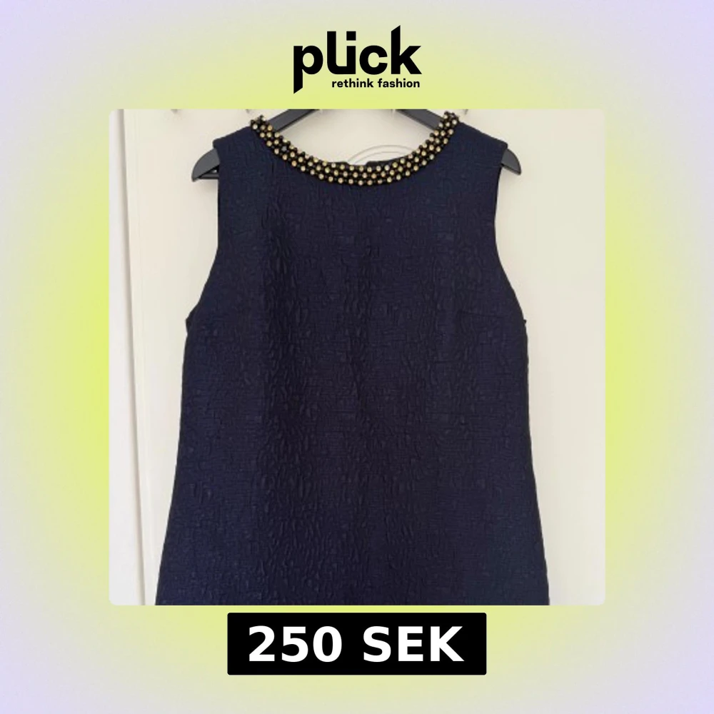 Snygg marinblå kortklänning med struktur i tyget och ärmlös design. Halsringningen är dekorerad med svarta och guldiga pärlor som ger en lyxig känsla. Klänningen har en guldfärgad dragkedja baktill. Pris kan disskuteras.