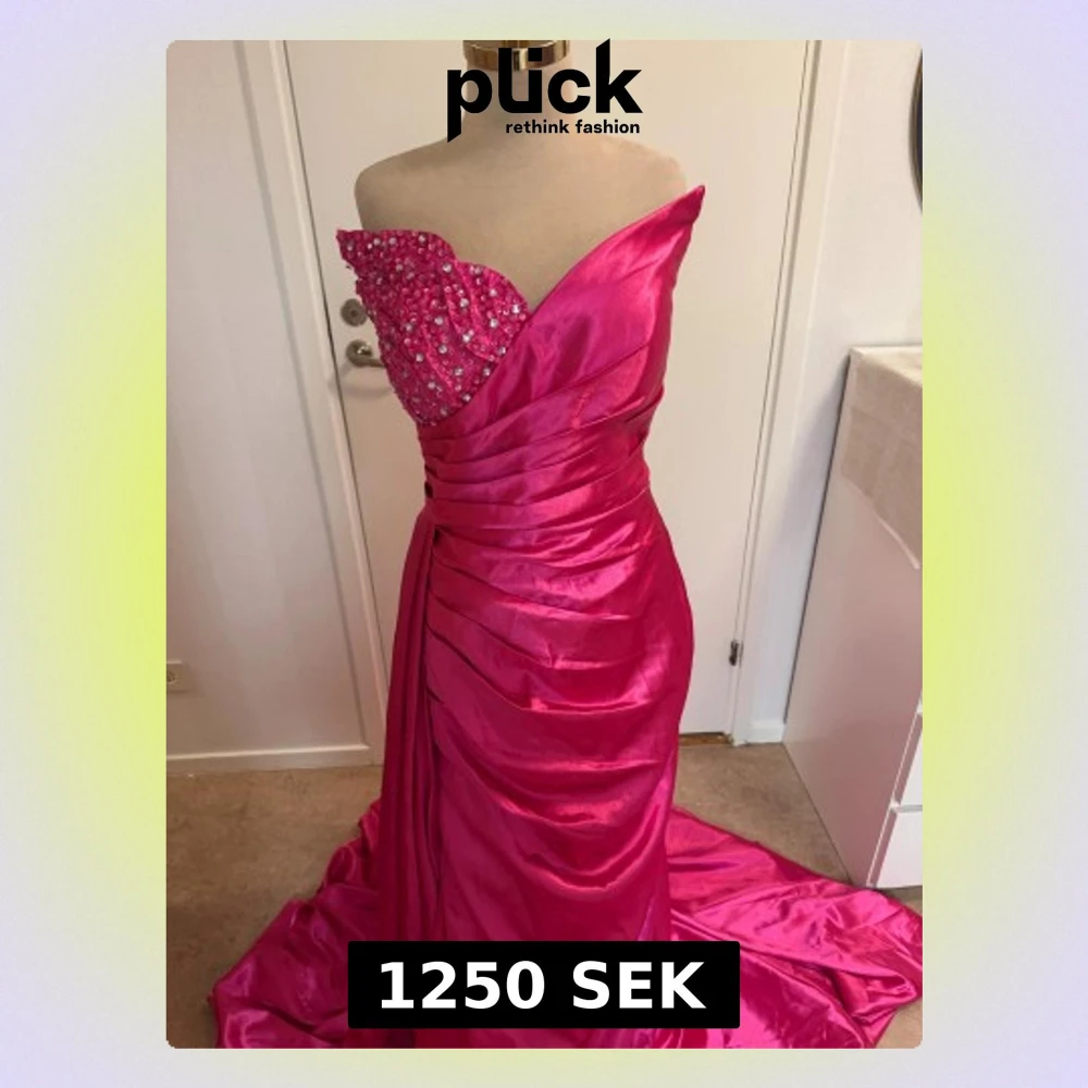 Snygg och iögonfallande lång ball klänning i stark rosa med glansigt tyg och draperad design. Ena axeln har en unik paljettdetalj som ger extra glamour. Klänningen är axelbandslös baktill och har en lång släp för dramatisk effekt. Perfekt för bal eller fest.