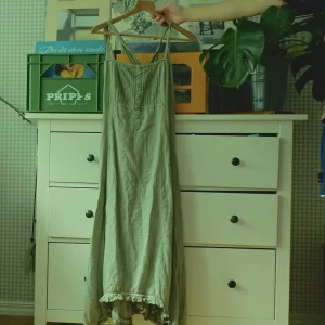 Grön maxiklänning med knappar fram. Den är fodrad med mjukt tyg över kroppen och har fransar och spets nertill.
