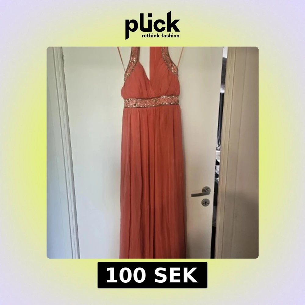 Säljer en korallfärgad långklänning från Cotton Club med v-ringning och breda axelband. Klänningen har glittriga detaljer med paljetter vid midjan och axelbanden. Perfekt för bal eller festliga tillfällen.