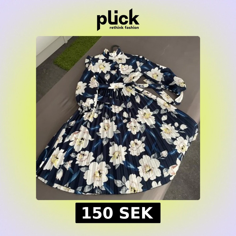 Säljer en marinblå långklänning med stora vita och ljusgula blommor. Klänningen har långärmade ärmar, hög krage och ett plisserat tyg som ger en snygg siluett. Midjebälte medföljer för extra stilpoäng. Perfekt för dig som vill sticka ut med ett elegant mönster.