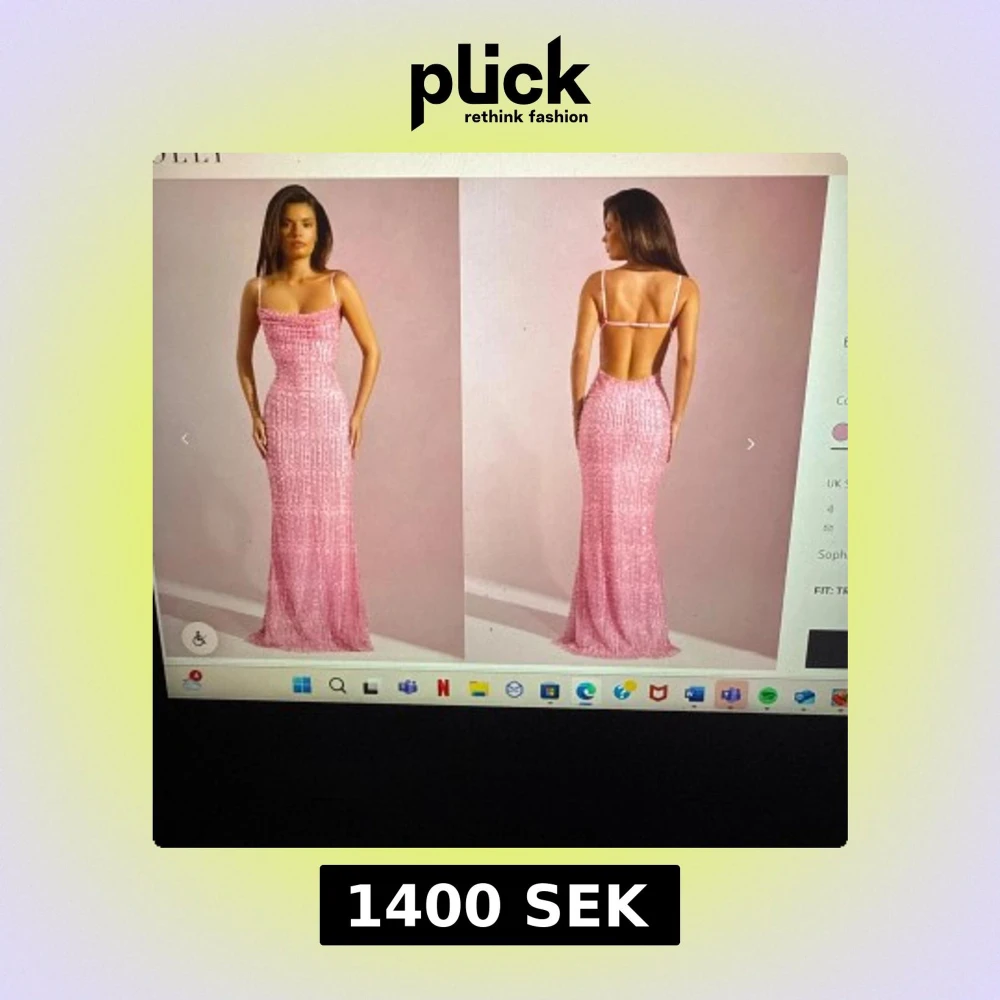 Säljer en superfin rosa långklänning med glittrigt mönster och smala axelband. Klänningen har en snygg öppen rygg och figurnära passform som framhäver siluetten. Perfekt för dig som vill sticka ut med en glamorös look. Från oh polly
