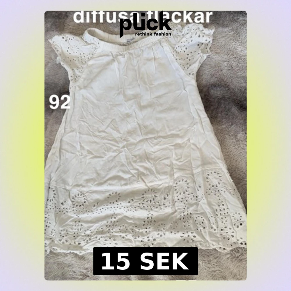 Söt vit kortklänning med broderade spetsdetaljer på ärmar och nederkant. Klänningen har korta ärmar och en avslappnad passform, perfekt för varma dagar. 🌸Diffusa fläckar. Storlek 92