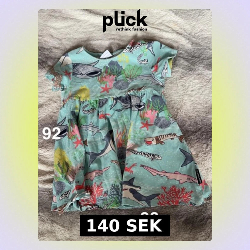 Supersöt kort klänning från Polarn o pyret i ljusblått med färgglatt undervattensmönster med hajar, koraller och sjöstjärnor. Perfekt för dig som gillar lekfulla prints och bekväma plagg.🌸 Fint använt skick. Storlek 92