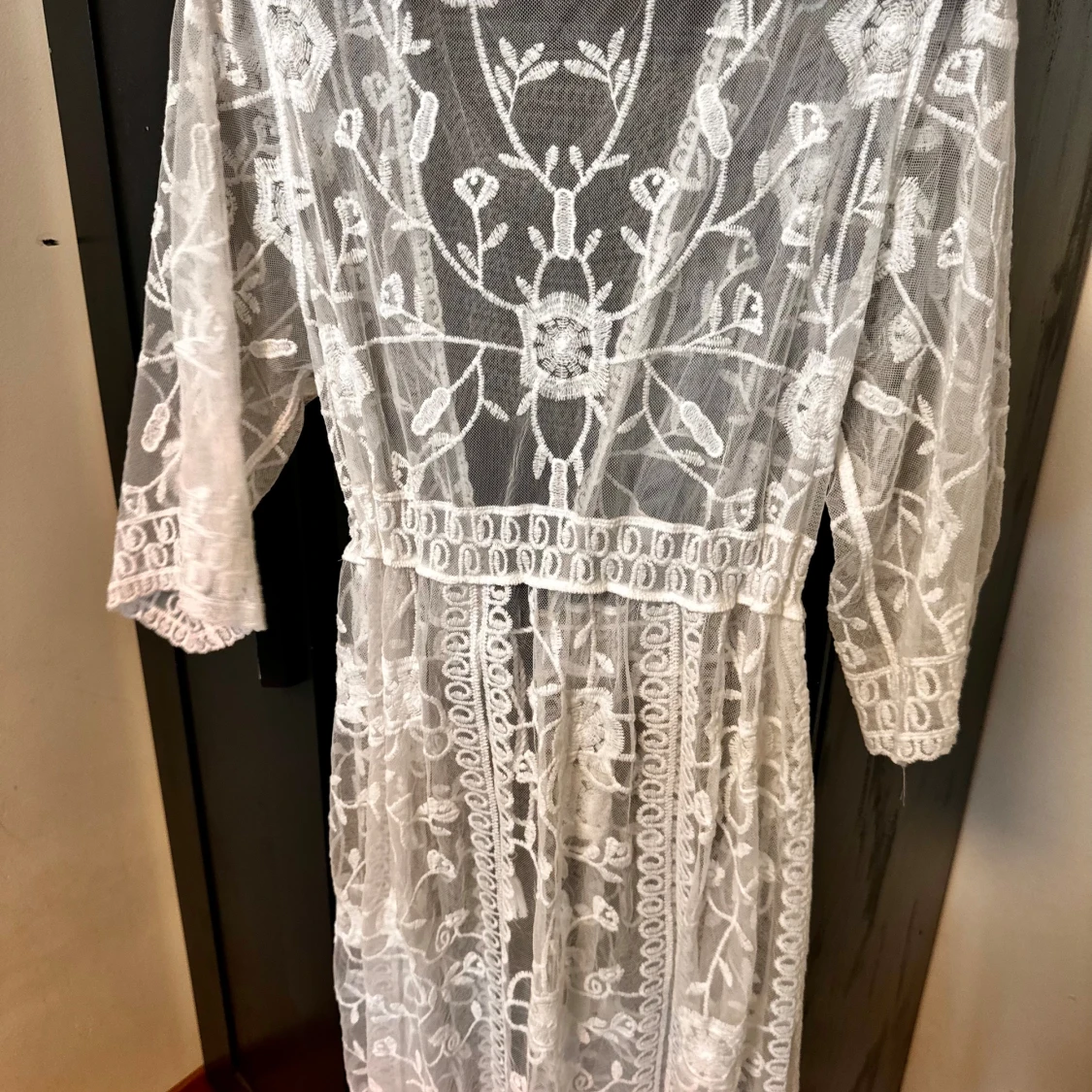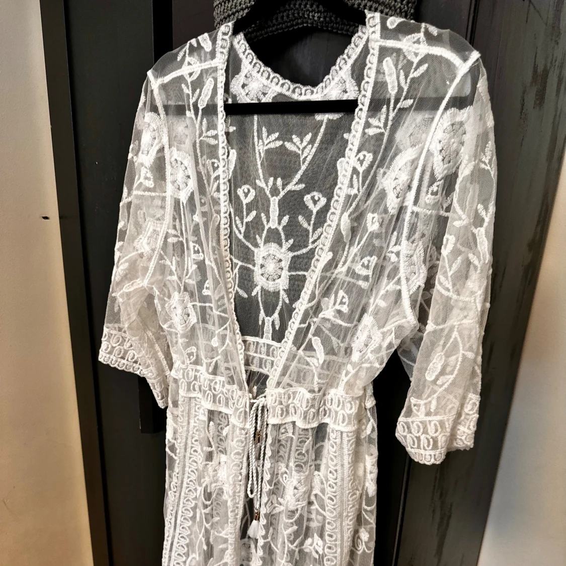 Säljer en superfin vit spetsklänning med vackra broderier. Klänningen har trekvartsärm och ett knytband i midjan för en perfekt passform. Perfekt för sommarens fester eller en romantisk dag på stranden. 💕