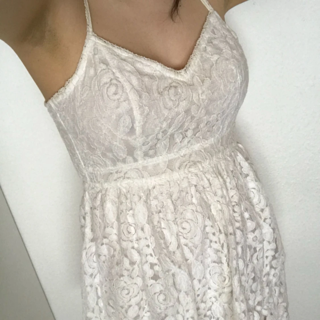 Superfin krämvit sommarklänning! Finns en fläck som visas på bild tre, ska försöka tvätta bort den. Syns inte supermycket pga klänningens fall men kan vara bra att veta :) Frakt 45:- eller möte i jkpg/habo 🌼