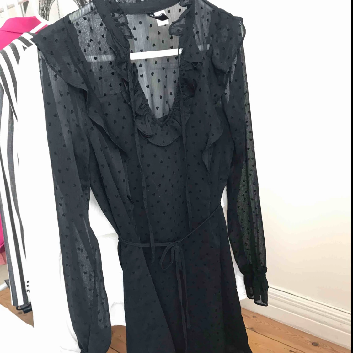 Svart klänning delvis i genomskinlig mesh med hjärtan. Strl 34, passar 34/36